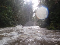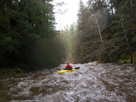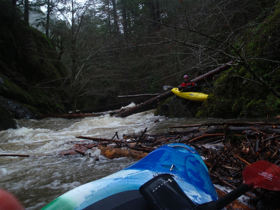 On the third day of our end of 2011 trip, we woke up to swollen river thanks to the 4.5 inches of overnight rain. With all the main stems raging, and our plans for Diamond Creek nixed thanks to over 20 feet of water in the North Fork... we headed up to what we expected to be the easiest section of new (to us) whitewater in the area. Even at the top of the Middle Fork, we knew that we would be on flood stage water. In a river bed that is only 10 feet across, we also knew that this would likely create a significant hazard for wood interactions... a fear that was realized a few times.