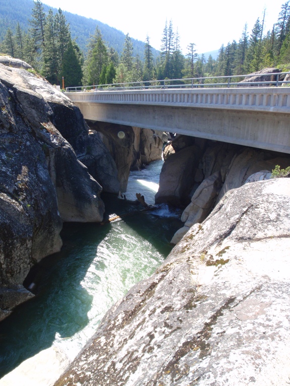 Clarks Fork Bridge (IV to IV+). Boof the left, avoid the rock in the landing on the left, avoid the sieves on the right, head downstream and boof over the ledge below. Catch the eddy and take-out. Avoid the running the next drop blind. We portaged it when we ran through the Donnells section. It is a crack drop that didn't look clean. I would hate to swim it.