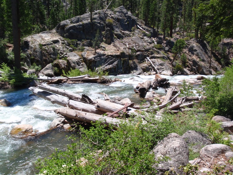 Portage (U). A narrow gorge dead ends in several sieve piles. Scout from the road before. The end of the gorge is at the Highway 108 bridge in the town of Dardanelles. We portaged on the right.