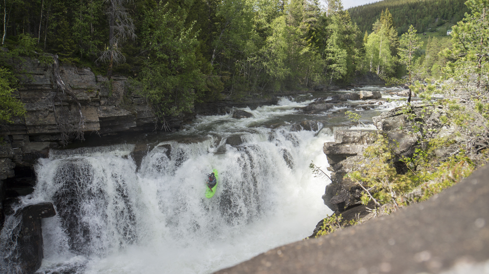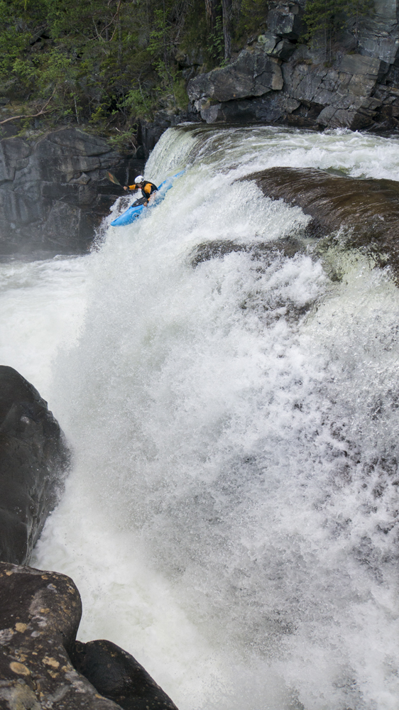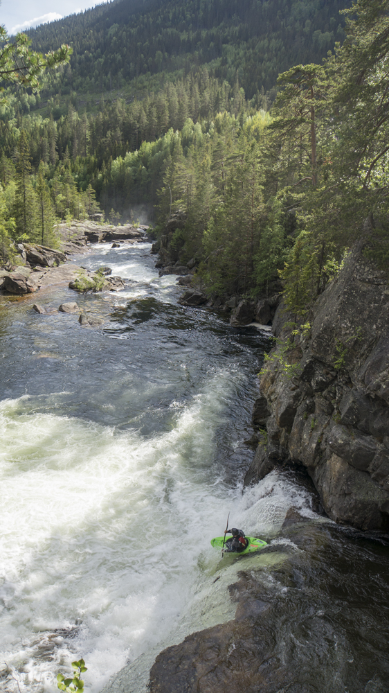 Telemark is the first region to run in Norway each year. Because of that it is typically dry by the time that the hordes descend on Voss looking to throw themselves off of big waterfalls and slides. In 2015 however there was a very large snow pack (~200% normal) and with the record coldest May on the books, snow was not in limited supply... and therefore neither was water for the rivers across Norway. Our plan was to start our trip on this short section of river that is only 1 mile long and boats a back to back combo of 5 waterfalls. Putting on around 5 pm our plan was also to camp at take-out. A pleasant dirt turn around area right on the water and only a 5 minute walk from the lower falls.