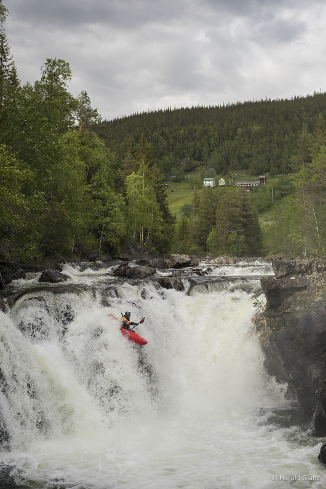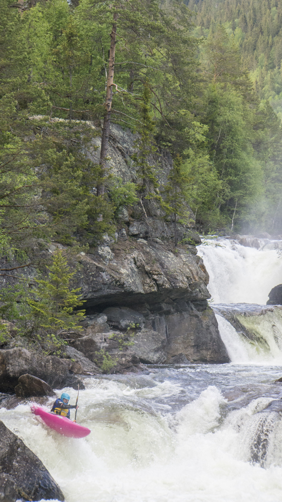 The river itself we found to have an optimum flow. I had seen videos of it at high flow and the last falls made me nervous for sure. I was relieved to find a much more manageable flow. I have also seen some very low flow videos online... it looks equally less appealing at the low end as the high end. In our medium flow, I thought the falls had clean lips, the landings were padded, but there was also time between the first and second, as well as fourth and fifth falls. The last of which is by far the most serious as they are very linked together and there is a mean hole where the water wants to push you. But if you are in Norway to boat, this will likely become the norm for your trip.