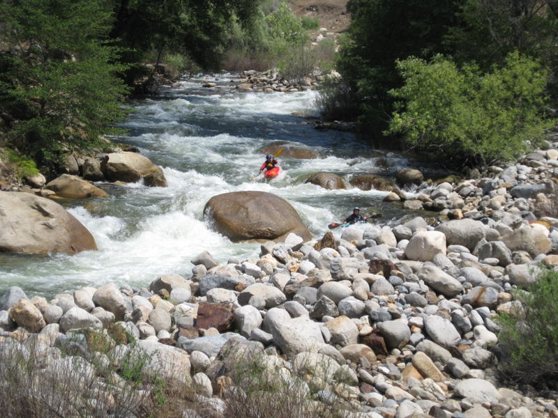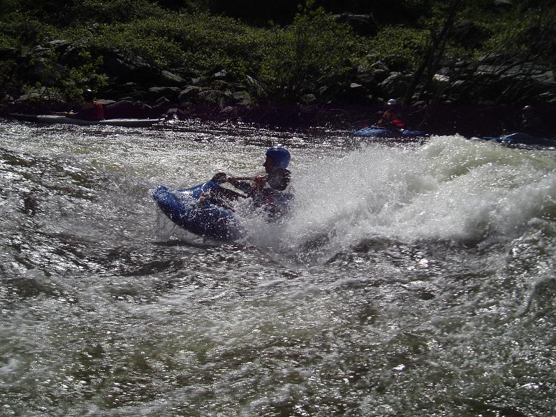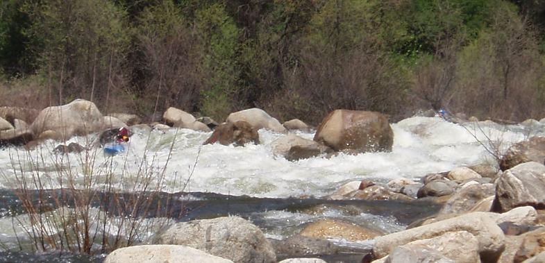 Tree (III+). A swim in the above rapid could be disastrous as just below (no pool what so ever) there is a tree across the river. There is a small channel about 20 feet wide on the right which goes around the tip of the tree. Parts of the tree can be seen downriver, lodged after they broke off. This rapid then bends around an easy class III which ends in some huge but avoidable holes, one of which swam Dave while chasing a kayak down. Update 2008: The tree is long gone and the channel is open, though there is still a fun line on the far right, there are still some good size holes throughout the runnout.