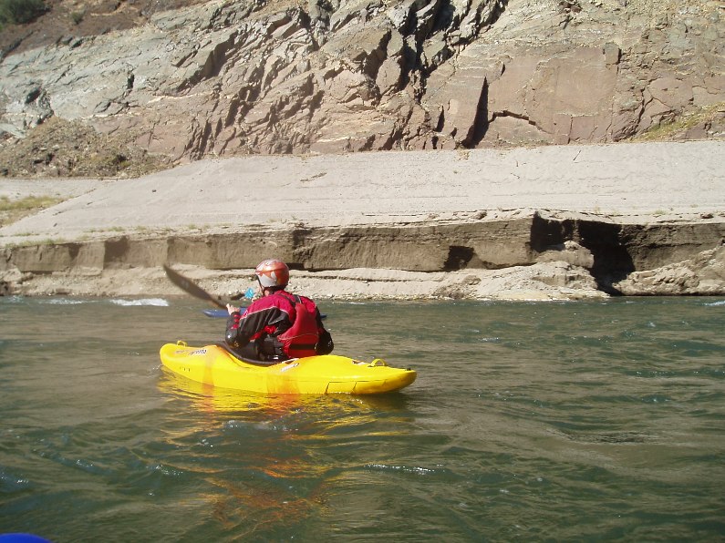 As of 2008 there is a lake shuttle service offered for $175 for up to 8 people. See the American Whitewater write-up for the information. With the lake elevation at 703 feet, it was very border line whether the paddle was ok to do. It was tiring and tedious and was almost long enough to let us forget the fun we had on the river itself. Word has it that people don't even bother thinking about this run if the lake is above 750 feet elevation. I can totally see this as being true. I think ever foot of lake elevation would add 100 yards of paddling. Around mile 5 on the run, you get to the silted section that has long been underwater and creates a very wide and shallow river bed. There are no rapids and the gradient is only noticeable by the sand rubbing under your boat as you slowly drift over it. Indeed it is not a "paddle out," but it is the fun part of the river. This shallow stuff continues for about 3 miles or so before you hit the log jam and the real paddle out begins.