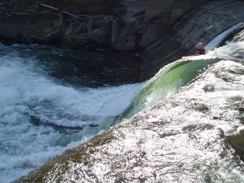 - Big Bend Dam (IV+). As I say in my Big Bend Dam write-up, this dam really isn't that hard, just line up straight and it is easy. However If you were to drop over it sideways and flip, it would be most painful. It also turns out to be a lot bigger in person but is worth running for anyone with class III skills. Also, it is 0.6 miles below the put-in and has a nice beach on the left right at the dam to scout from.