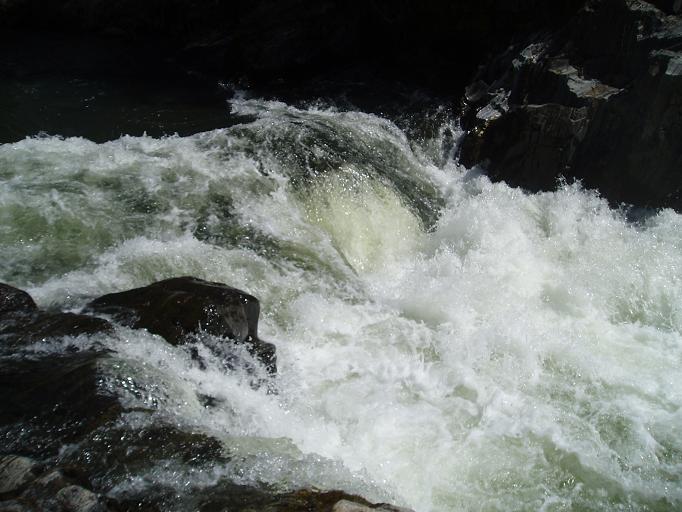 Get Right (IV to IV+). As long as you make the move, this rapid is easy. The rapid runs down a tongue and slams into a rock. The left side of the current drops into some very large holes while the right side slides off into a few more rocks. The move is to cut across the tongue and catch the small eddy on the right. This allows you to not get pushed up against the rock and flush off either way. Once you make the eddy peal out of it and run the hole, avoiding any shallow rocks lurking to hit you.