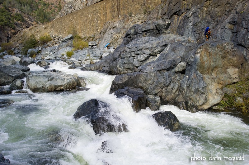 The river starts off with a mellow mile of mostly flat water with one nice warm up rapid. Once you cross beneath the Highway 70 Pulga Bridges, it gets game on quick. After a long and clean rapid, the river gets tight, constricted, sievy, steep, and pretty darn fun. A few short rapids lead to the first big rapid, I think most will portage the rapid however it is runnable. At 550 cfs the sieves were way too in play for my taste, apparently at 700 they filled in more and made the rapid easier. The AW flow study mentioned the portage was on the river right and required technical rock climbing. Diane and I portaged on the left and had an easy carry until the final 15 foot ledge required a throw-rope assisted down climb (really was more of a rope lowered). Luckily there was a knob of rock 10 feet from the ledge that had a grove at the base of it to retain the rope. With that, I lowered Diane down followed by the gear and finally myself. A flick of the wrist and the rope came back down to me.