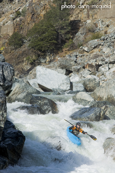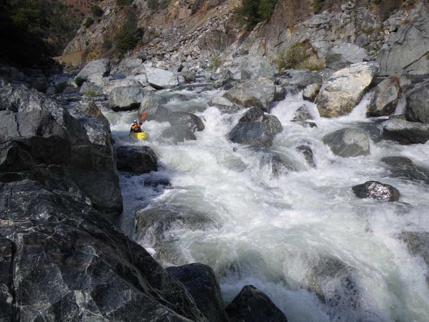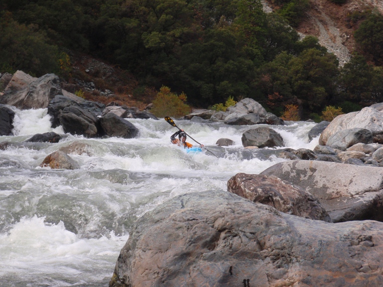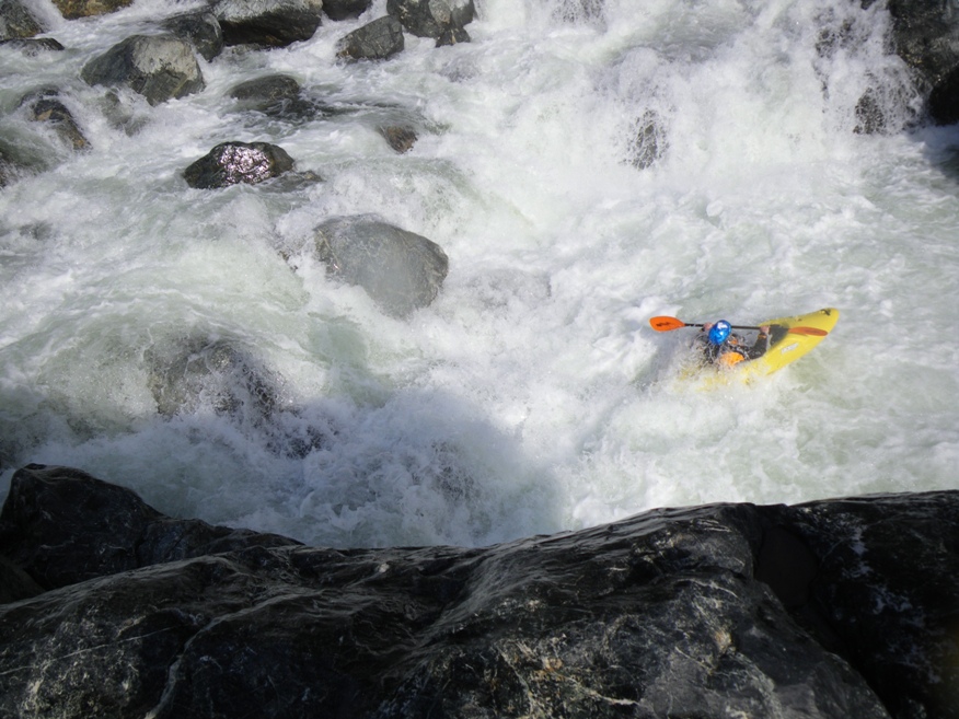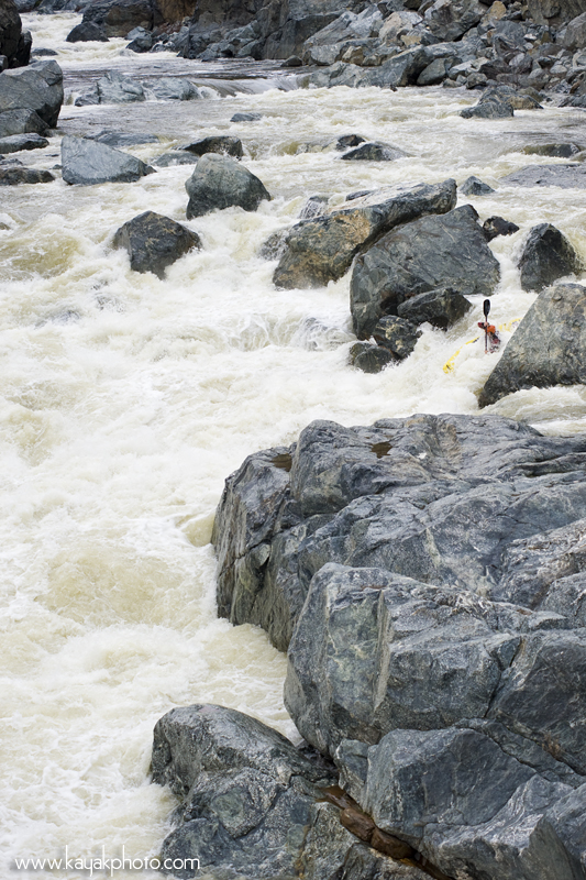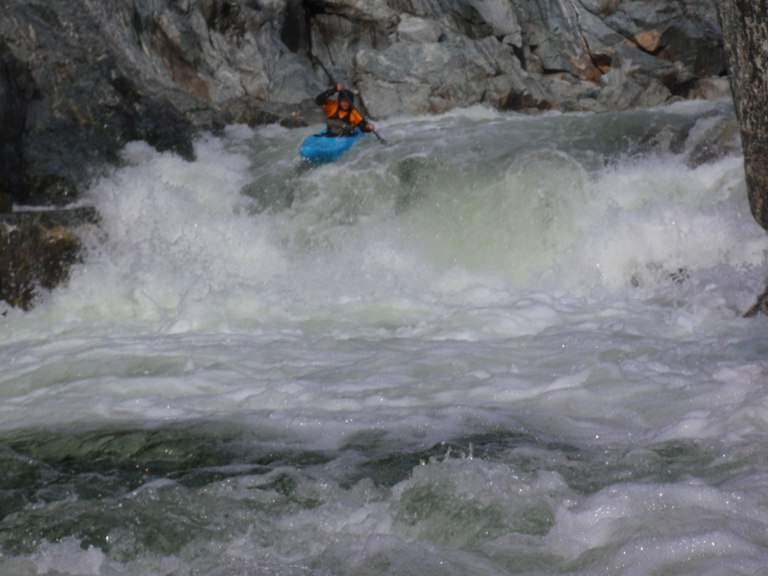 Toboggan (V- to V). At low flows only the right channel looks appetizing. A boulder dodging channel makes you feel like you are on a luge course. The crux is to delay boof the sliding hole at the end as it feeds hard into the right wall which is undercut and then feeds into some barely submerged sieves. At higher flows the hole pushes harder. The left channel is a slide into a vertical drop and apparently looked much cleaner at 700 when Darin and some of his friends ran that way.