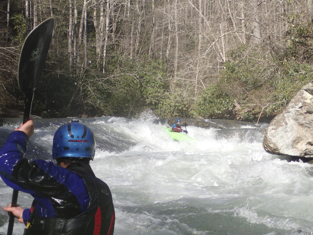 Vortex (III+ to IV-). A fun drop just below Clog. We started right and worked far left through a hole. The river then jogs back right and slops back left through a soft hole. You can drive right across the slop to avoid the hole or just straighten out and punch it!