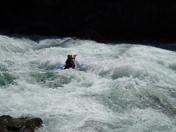 Long One (IV+). Boat scouting is a necessity as water was in my eyes and I only know the details of the line we took. We entered right of center. A little way down we were on the right shore, and road the cushion off (to the left) of a rock where the water was piling up. We now worked our way left to end between two large rocks off of the left bank. At low water I think a rock may appear in this slot, so be aware.