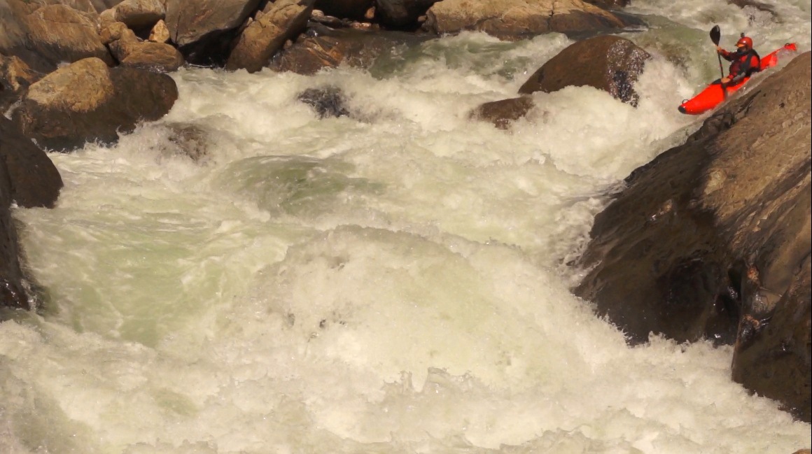 In my mind this is the hardest of the runs on the North Stanislaus. It has some huge class V+, some of which I do not believe have ever been run, others run just a time or two (though even that seems staggering). In between is nothing but class IV+ moves and class V rapids. The run does not let up until you pass through the final gorge. The rapids are mixed in their form and quality. Some are super steep and long boulder bar gardens full of sieves and occasionally snuck around to avoid even worse hazards, others are steep pool to pool one move drops amongst boulders, and others are multi move slides. In all, the miles here do not tick by fast as you're are constantly scouting or eddying out. Even knowing the lines, the progress was slow as the hazards were ever present and portages are sprinkled throughout.