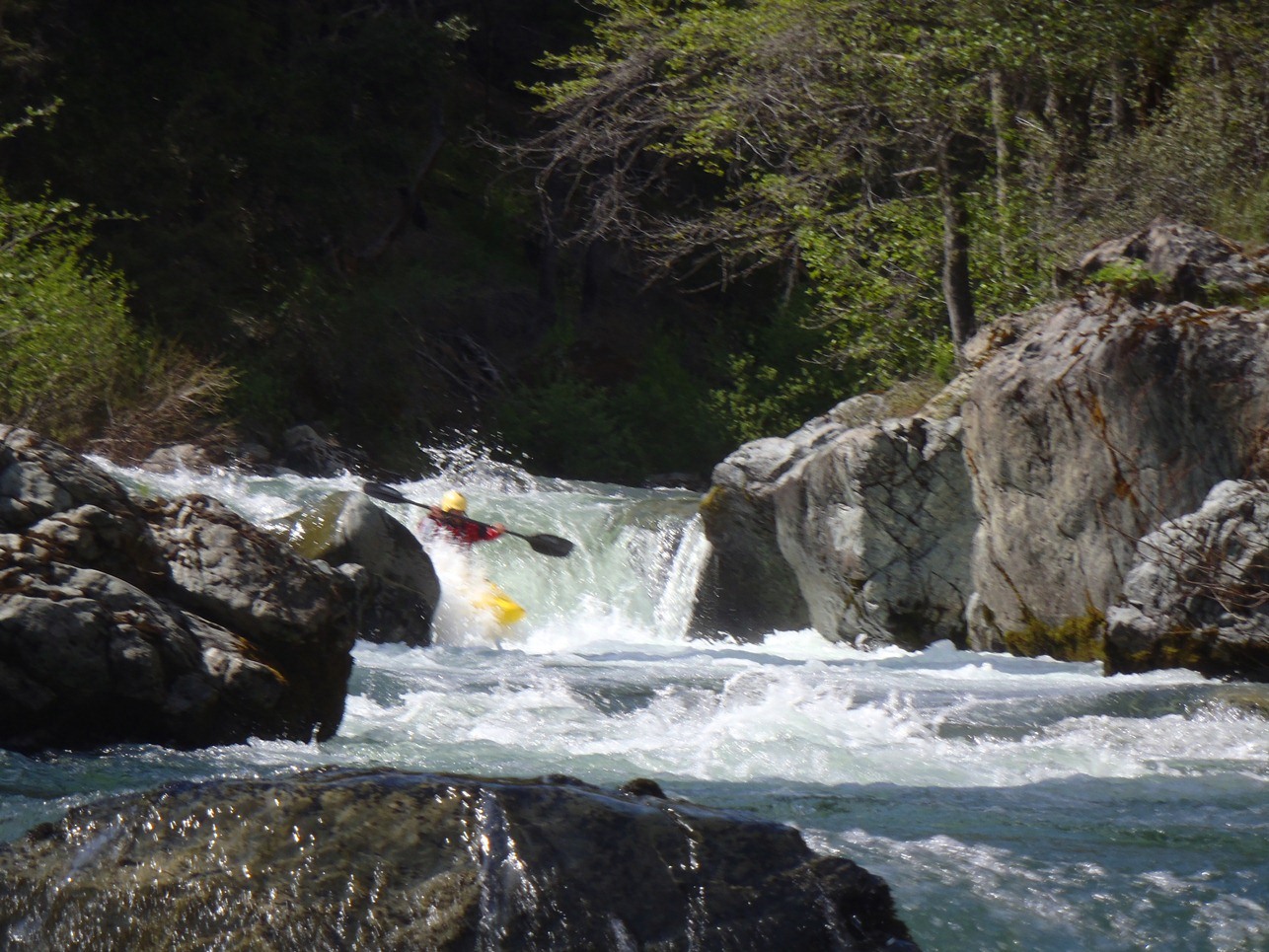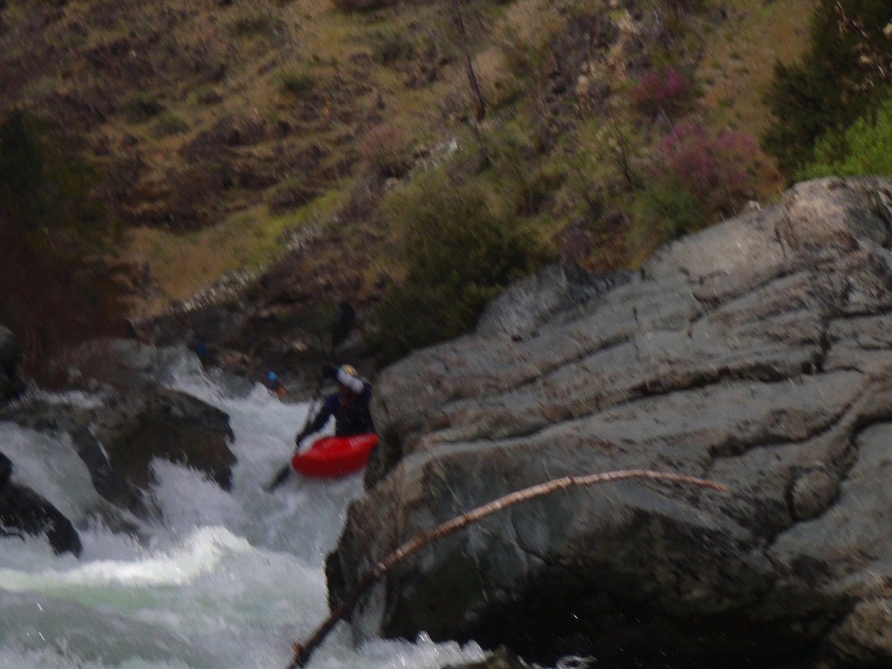 - Orion's Mom's Hole (IV). I wish I could describe this one better... because it is a serious hazard named after a friend had a close call here. In a small walled gorge, the river splits around a midriver rock and creates two channels. We went right (but left also went). It then splits again around another midriver rock. The second one, you really want to be right on. The left channel is turblulent and stuffs you into a pocked/undercut on the left wall. It is a dangergous spot, so keep an eye out for a plays where the river splits twice quickly around two midriver rocks.