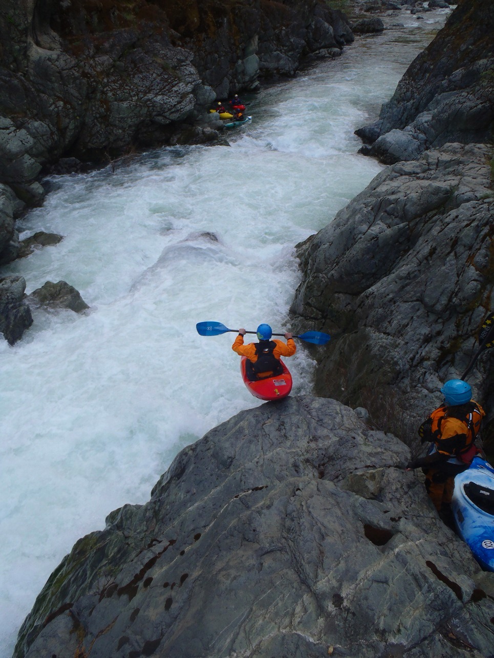 The End (V). One of the larger rapids on the run is the 2nd to last rapid. I only remember the details of the exit which was on a left bend. I tried to boof the right edge of the large drop and ended up taking a rock straight into my bum. But that was actually a welcome surprise because it looked like a mean hole... so the shallowness was in a way better than getting worked... I think. I guess moving back left across the final drop would have been idea. 1 more class III-IV rapid awaits and you will see the bridge.