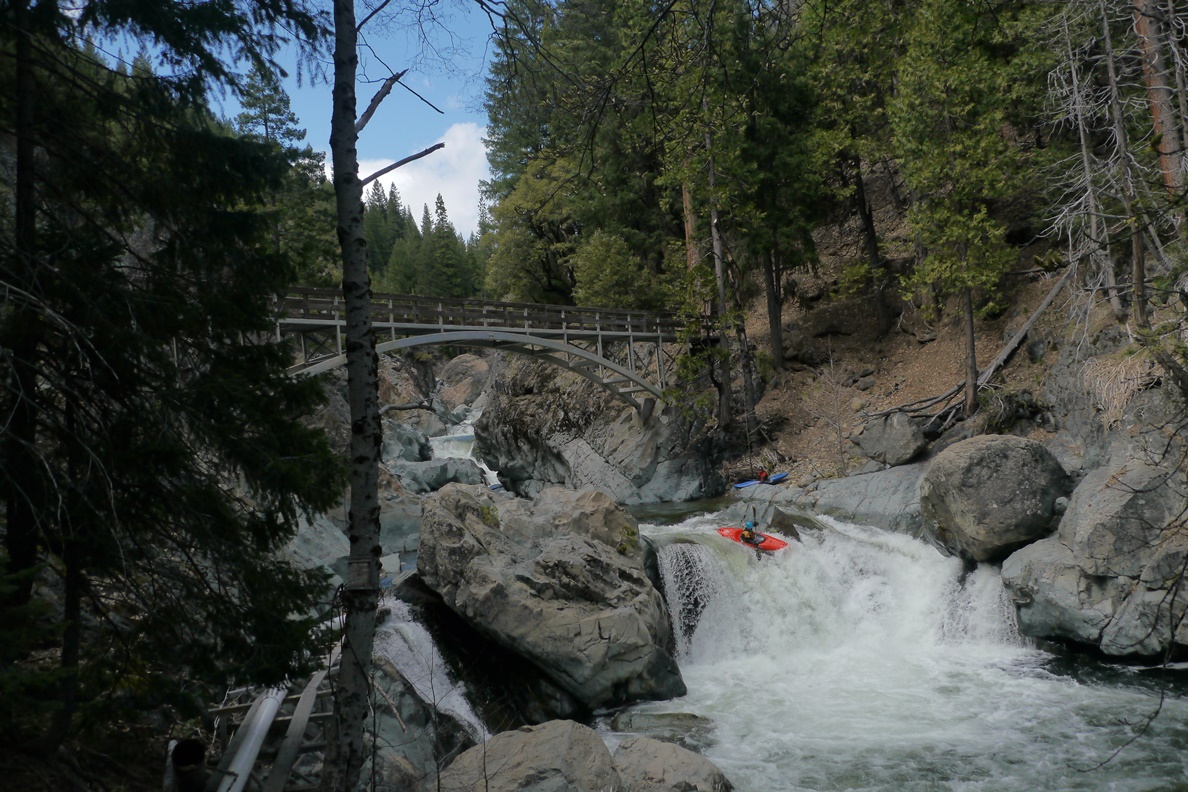 - You can put in above the bridge by crossing and going upriver. This adds a class V stack up. This is also considered the "First Falls" and is notorious for swimming folks.