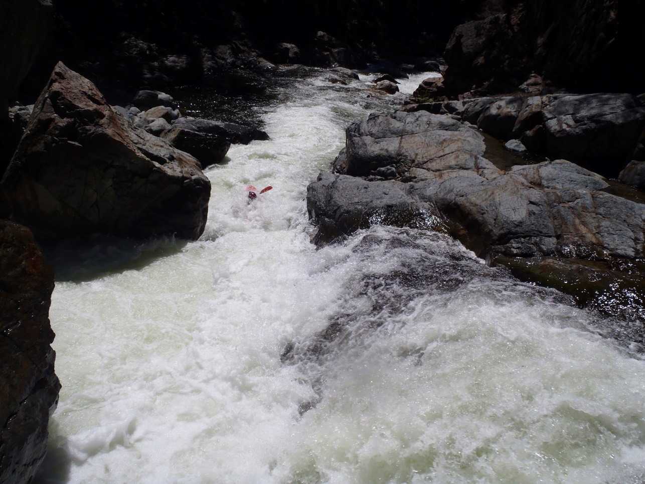 The run is short, though your first time down, unless you are a mad bomber, you will likely need 1.5 to 2.5 hours for the 1 mile of water (and of that, only 0.5 miles are hard!). Once you have the lines figured, runs can be as quick as 15-20 minutes. The rapids themselves are interesting. Most (at the lowish flow we had) were not harder than class IV+. The problem lies in that they are stacked on top of each other, even at the low flow the pools in some cases were nothing more than fast moving aerated water rushing to the next lip with only a small eddy to allow you a moment of reprise. The result was a section of water that felt very much class V due to the unforgiving pace of the rapids and the potential for issues if holes are not punched correctly. And if that weren't at all bad enough... as with any class V river, boulder piles inevitable result in sieves. So, don't swim.