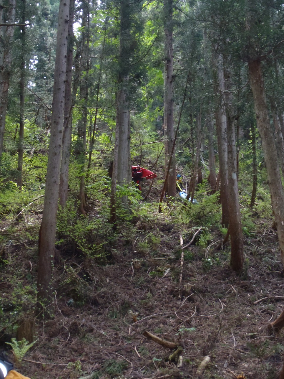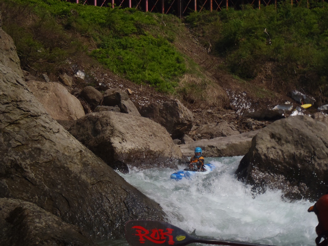 Finding take-out was easy, there is a short lake formed by a dam with easy access up the side of the hill. Put-in, we decided to drive up as far as made sense to make a full day. We decide to drive up several miles to the Red Bridge which marks the take-out for the Nakatsugawa lower gorge (which we did the next day). Below, the run was surprisingly mellow. Class II to III for several miles before to our surprise the river plummeted over a 33 meter tall dam. With a quick (albeit steep and muddy) portage around the dam, we were greeted by the hardest rapid (maybe class IV) of the upper half. Soon, the road came back into view, we portaged around another dam, this time a two tiered drop with large recirculation and shallow launching pads. We knew that the run was going to get more challenging at this point from what we road scouted. (We also came back a few days later to repeat this lower section).