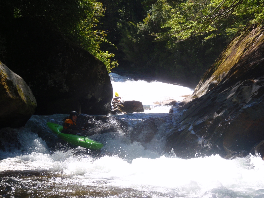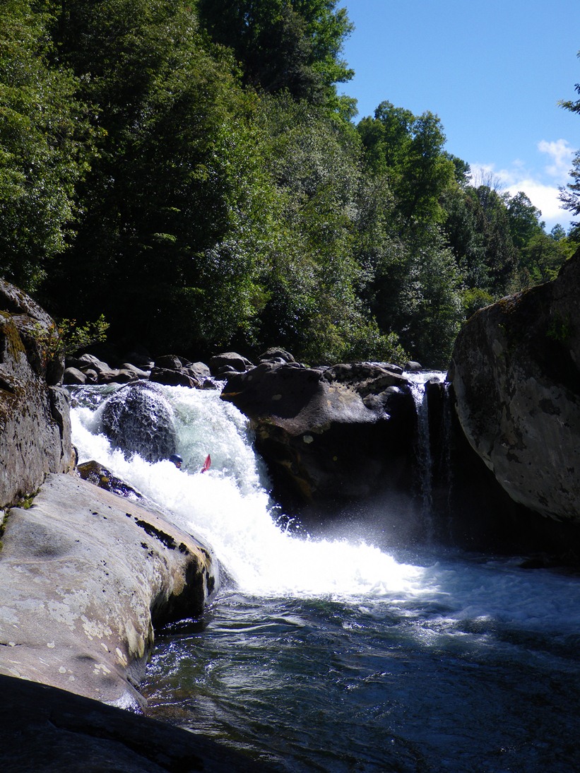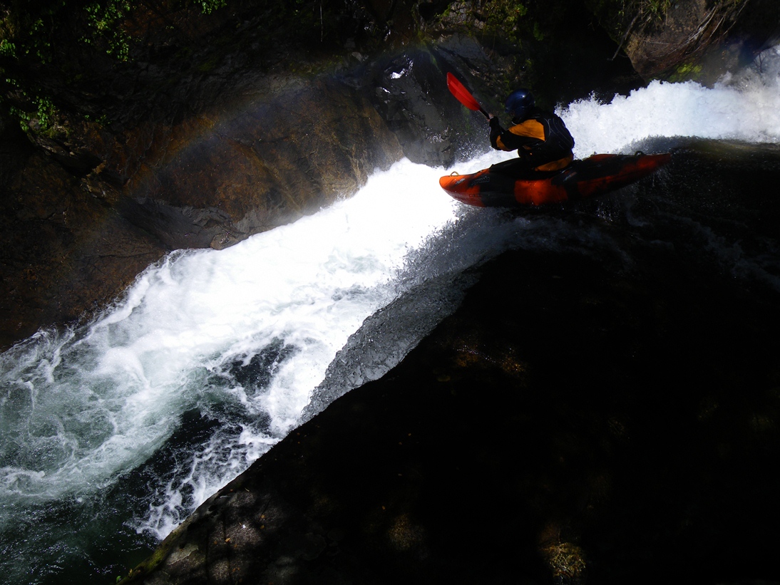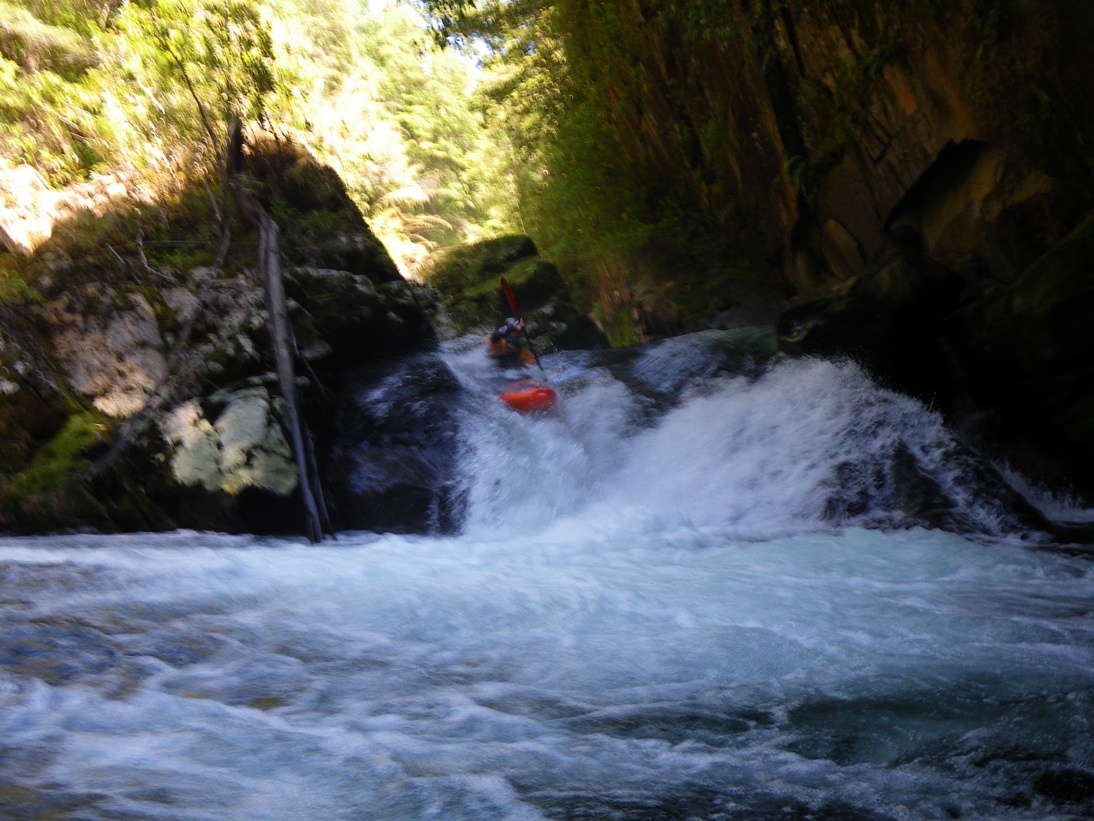 Gorge Rapid (IV to V-). In 2010, there was a log across the entry of the drop. With one person standing on the log you were able to boat up and over it with some help. The last person had to seal launch in from the right, which of course resulted in me pitoning. From there, go down the right channel, punch the meaty hole and then boof the exit on the right.