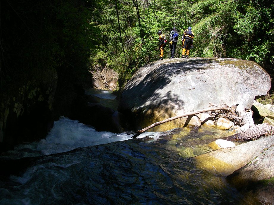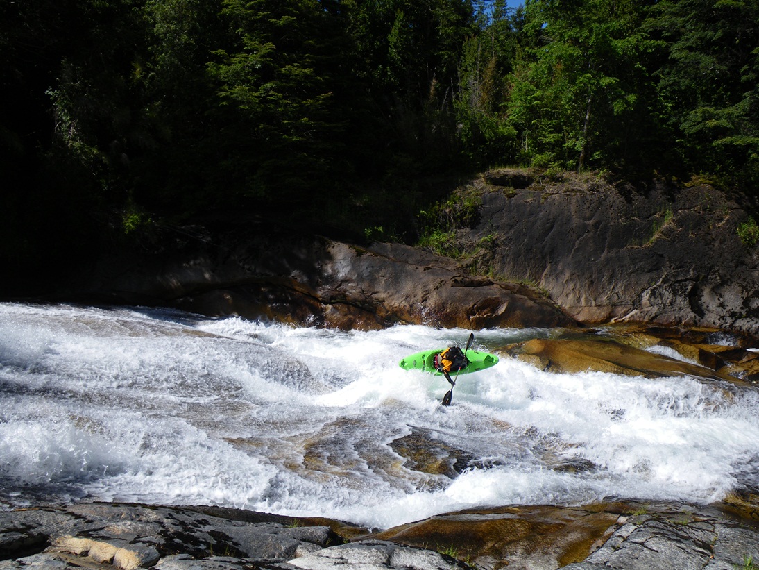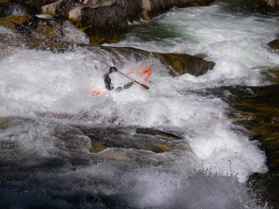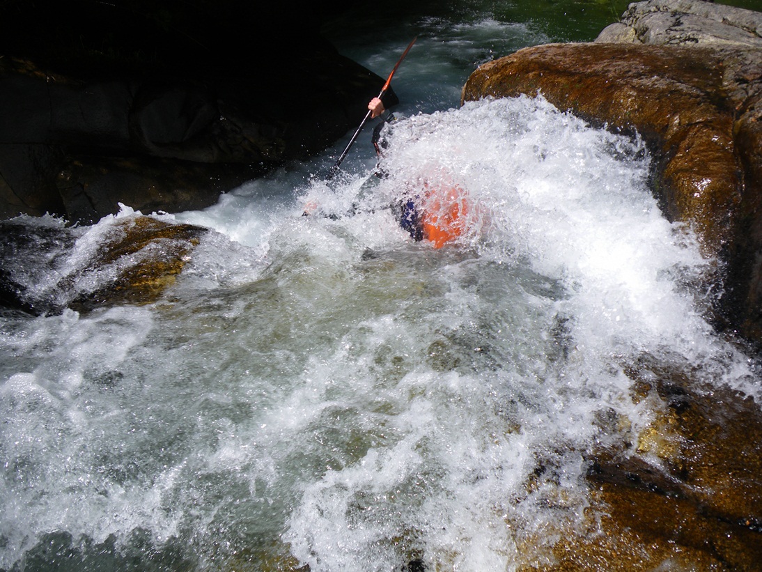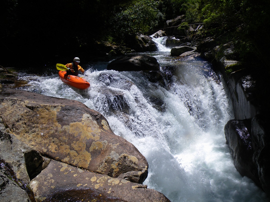 Gorge Rapid (IV to V-). In 2010, there was a log across the entry of the drop. With one person standing on the log you were able to boat up and over it with some help. The last person had to seal launch in from the right, which of course resulted in me pitoning. From there, go down the right channel, punch the meaty hole and then boof the exit on the right.
