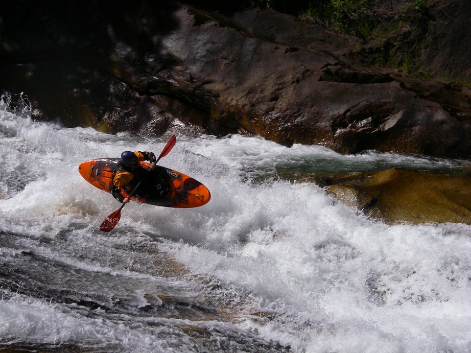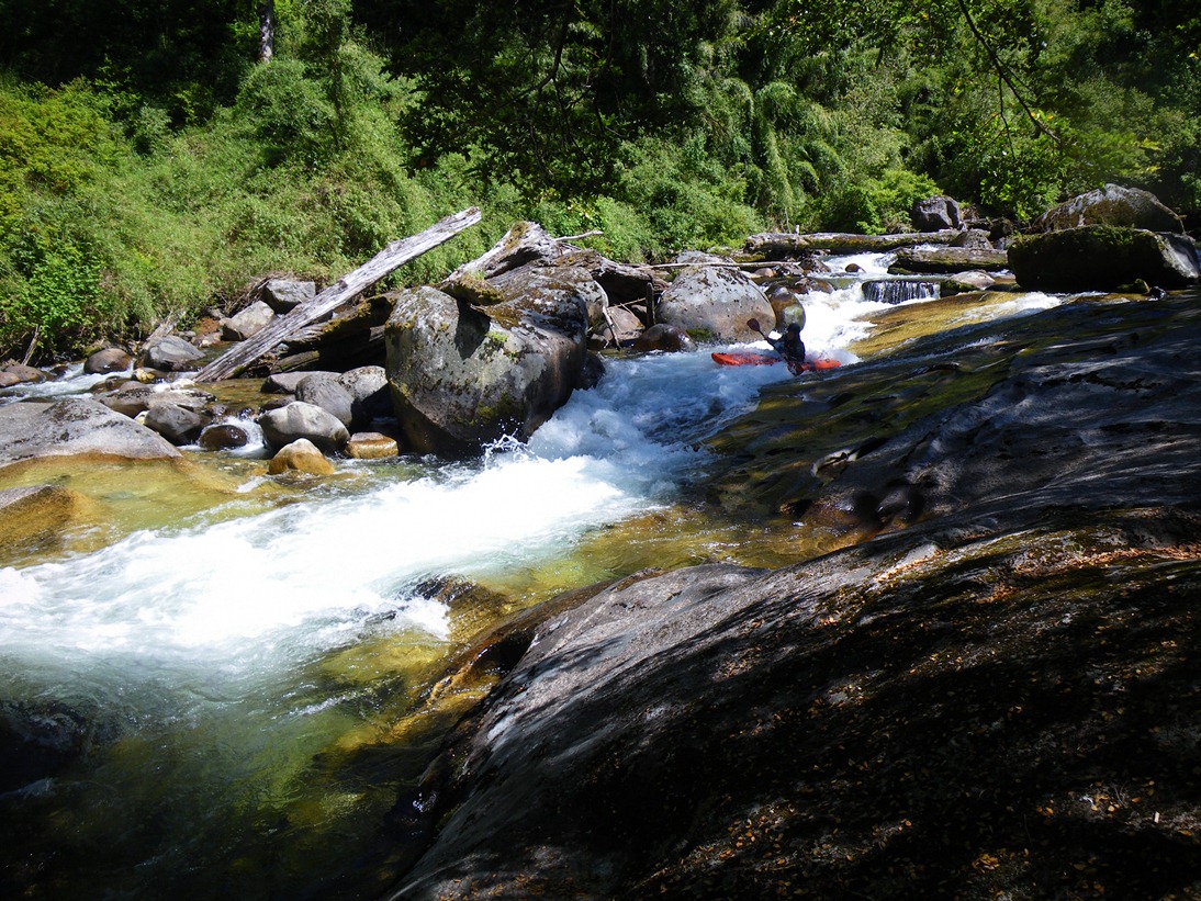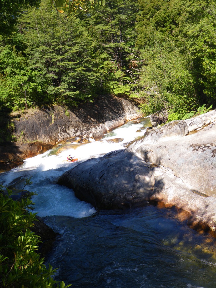 - California Slide (IV+ to V). The put-in drop has two distinct parts. The first is a steep 15 foot slide. We ran this down the center. There is then a short pool before the main event. A long medium angle slide that is best run right. In the middle there is a kicker that will land you on the rock ridge behind it. At low flows it is very hard to get to the right of the kicker. You can hike up river right to run laps on this drop. Just downstream is a small exit drop that is class III.