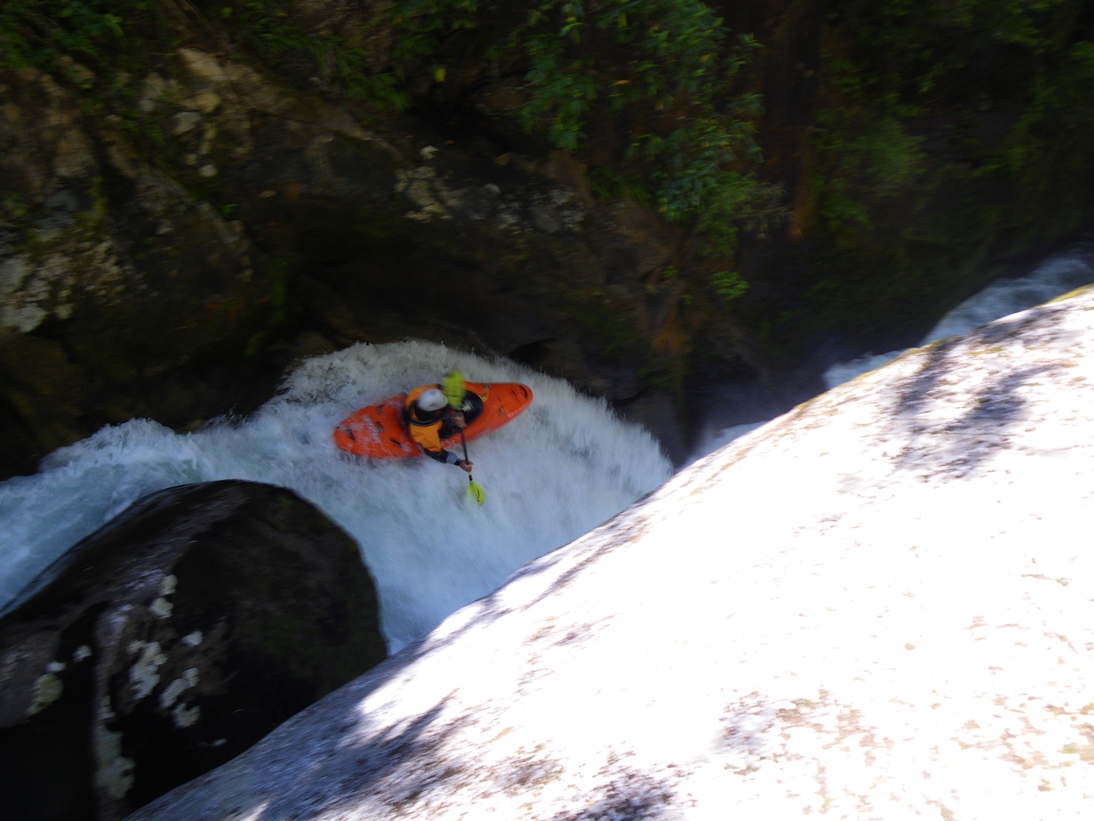 Dos Amores (V- to V). We didn't run this drop, we took out above it to keep the group together. This rapid is one of the better ones. All I know for sure is enter and boof the crap out of the right wall and enjoy the some 15 feet of free fall. I know just downstream is a good size hole and then you are at the lip of Demshitz and the start of the Lower Nevado.