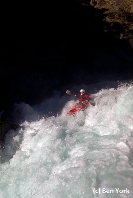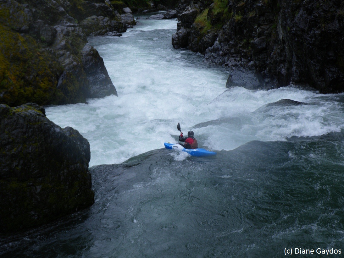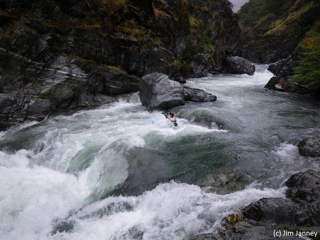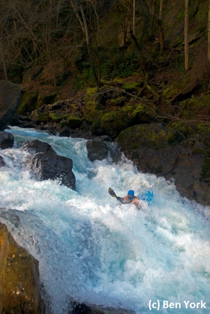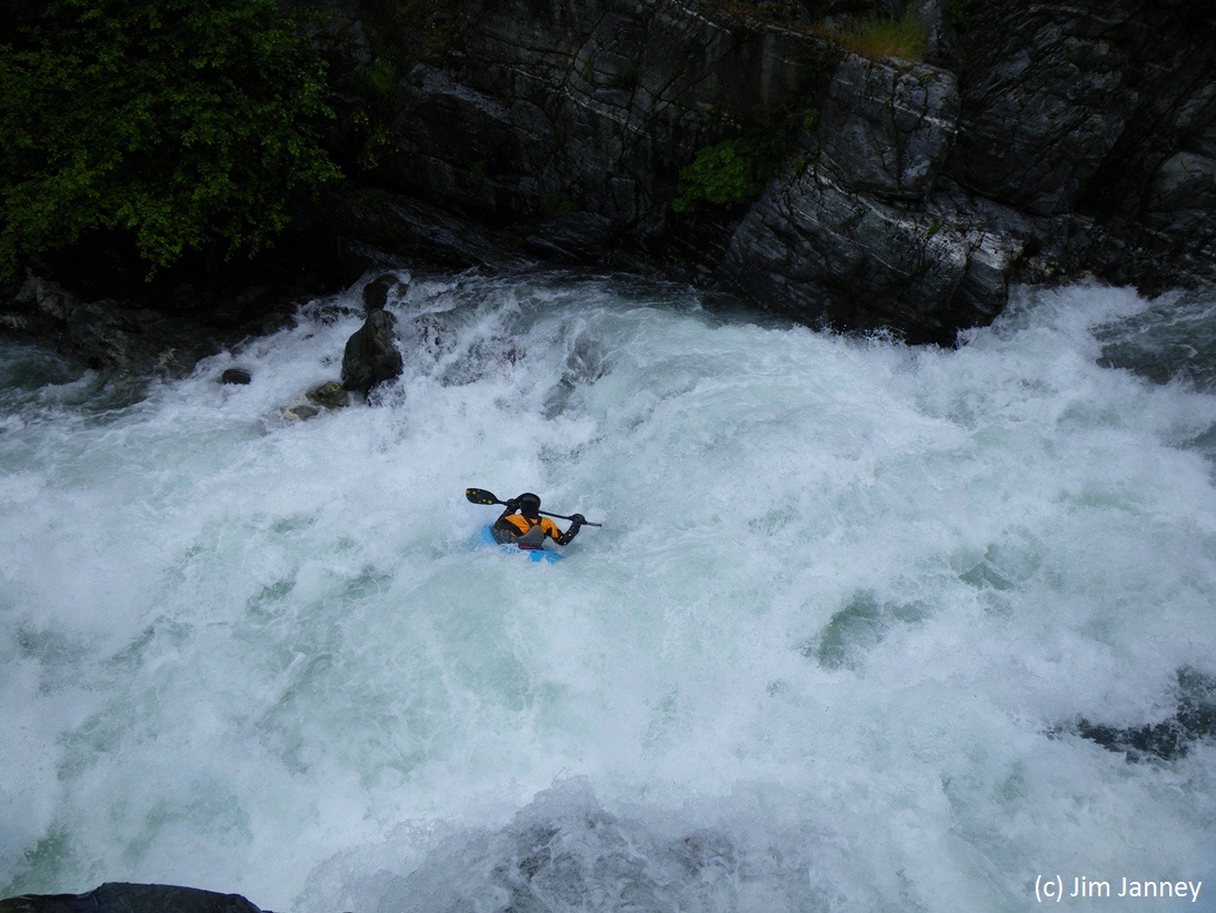 Blind Faith (V- to V). Enter and drop the 8 foot ledge down the left channel pointing a little right. From there, punch a few meaty holes in the run-out. There is no way to scout it nor portage it. Not unless you start hiking from well upstream perhaps...
