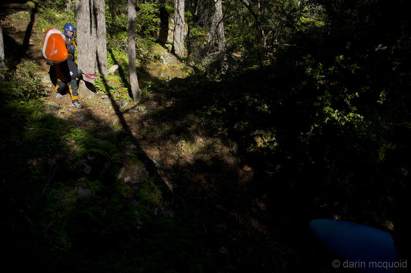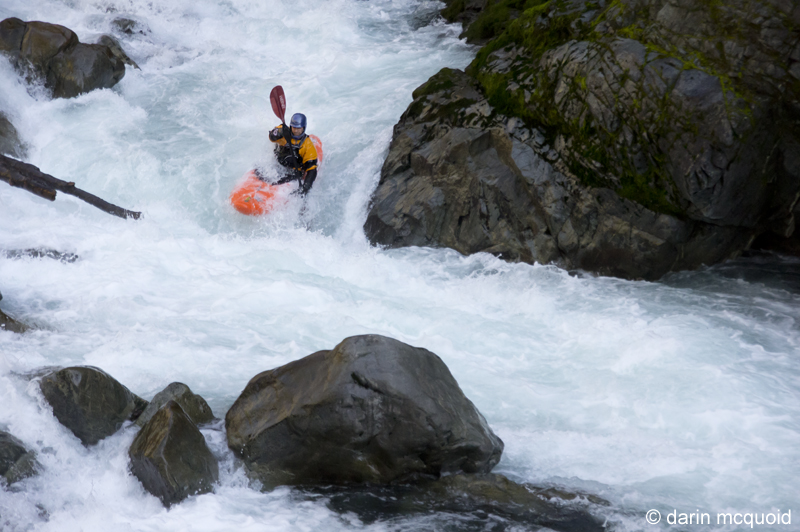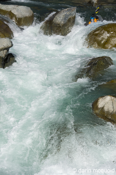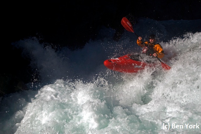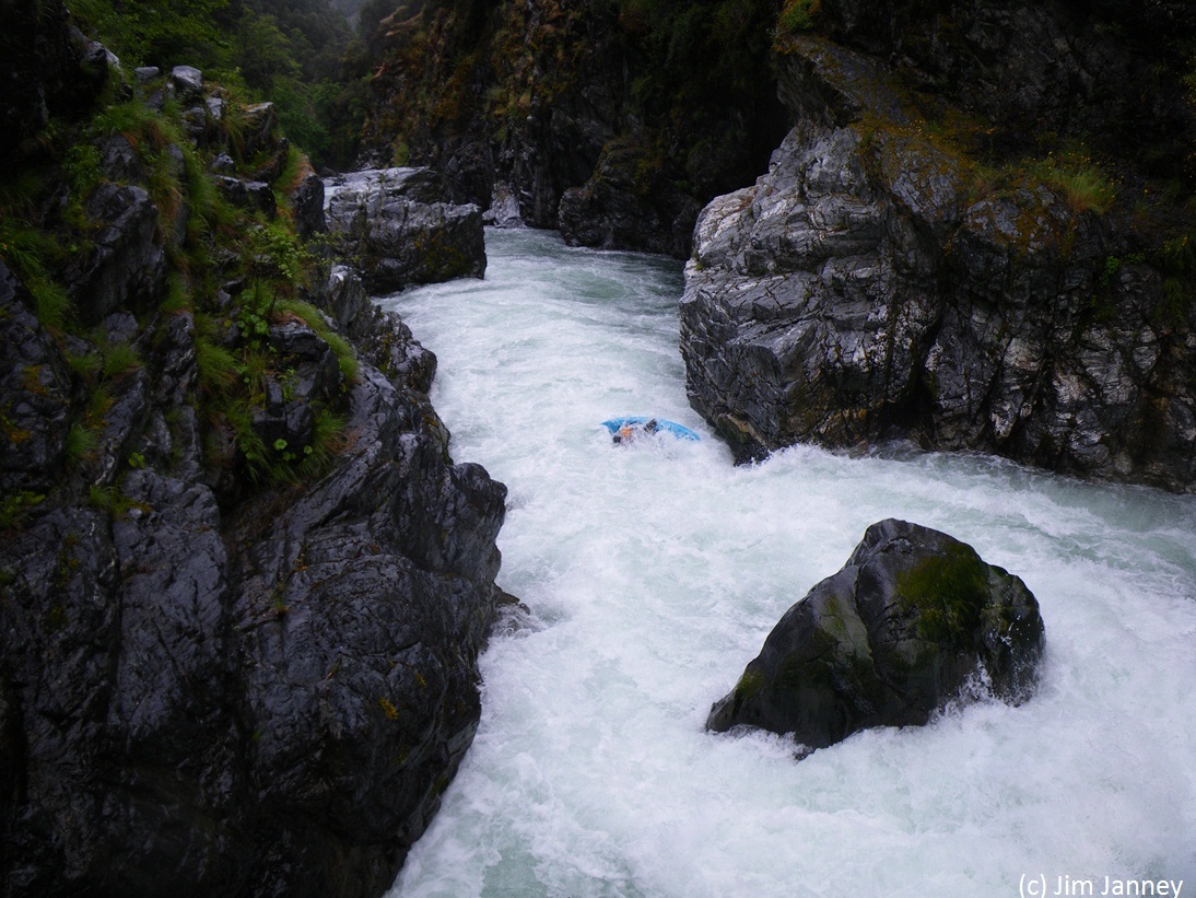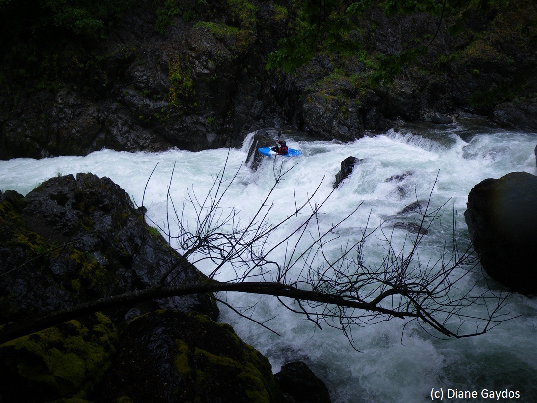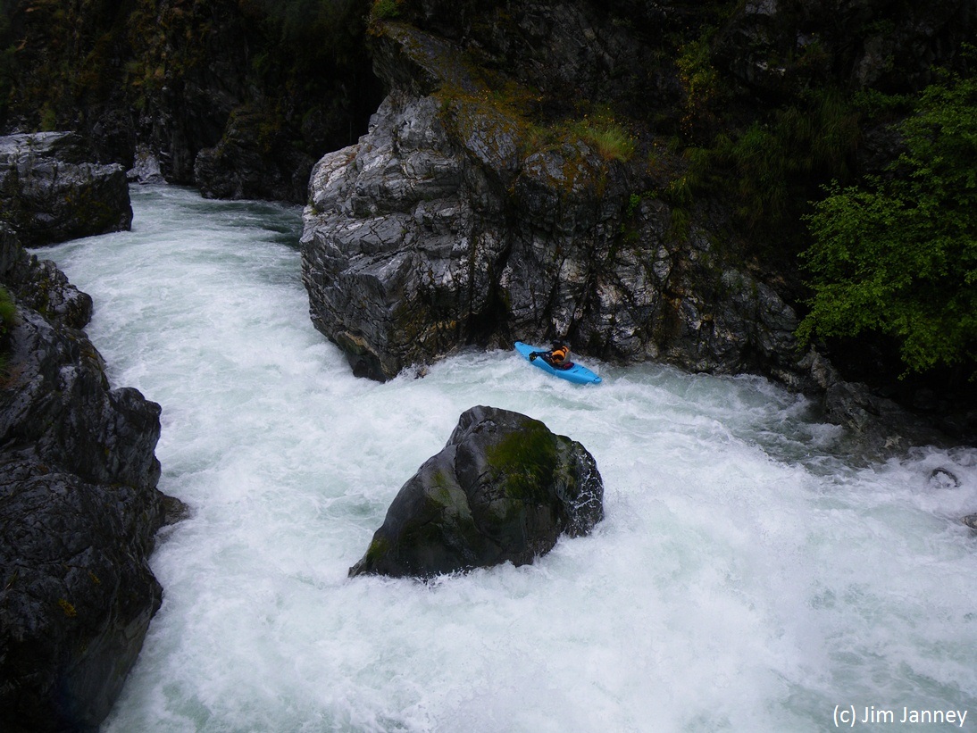 Blind Faith (V- to V). Enter and drop the 8 foot ledge down the left channel pointing a little right. From there, punch a few meaty holes in the run-out. There is no way to scout it nor portage it. Not unless you start hiking from well upstream perhaps...