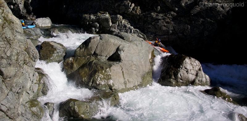 In Between One (IV+). A waterfall falls down from the left wall. We boofed down the left side and through a good size hole.