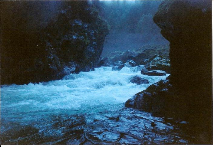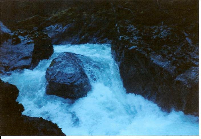 Short Chute (III). This rapid is in a steep part of the gorge and can prove to be a little difficult to scout (as I remember) so we didn't. It was entered center and ridden out.