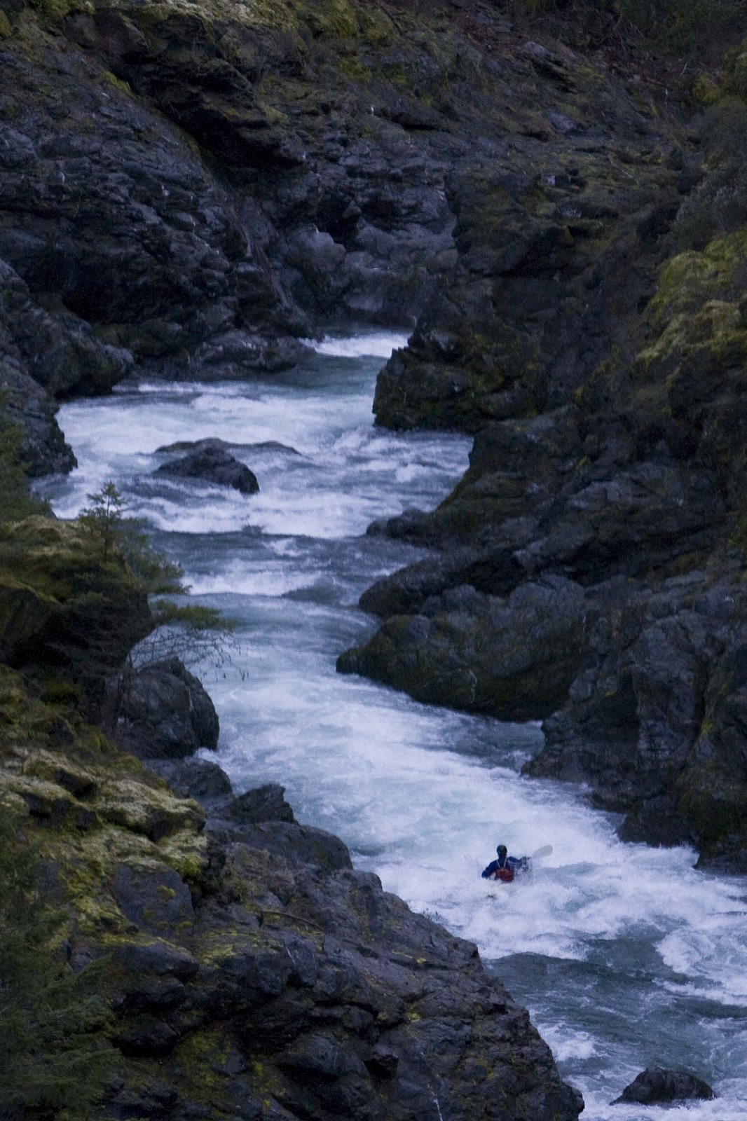 Part 2 (IV+). +). This rapid is immediately below "Part 1." It is the more impressive rapid by far. It begins with a hole that looks to be potentially sticky at high flows. This hole is on the left bank, one through said hole move immediately either more left or over right. There is a large rock in the middle of the river, more water flows right than left. However, be noted at low water much of the water flows underwater in to a crack between the large boulder and the right shore. In Winter, 2004 there was also a tree limb stuck in it only visible from the back which could potentially impale a upside down boater if they somehow survive the crack. At high water I would imagine both of these go out of play. -Scout both of these on the right bank at the same time