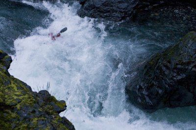 Hand of God (IV+). There are 3 parts to this long rapid. The first we ran down the right which then deposits you into a large river wide hole. This then leads directly into the next rapid which we also ran down the right and ends in a drop of a few feet. This then feeds into "Hand of God proper. The river goes over a ledge on the right or hits a cushion on the left, makesa a 90 degree turn and drops over a ledge into the flow coming in from the right, thus making another 90 degree turn this time to the left. There are undercuts not far below but at both 400 and 800 cfs they were not a hazard. This rapid is nearly impossible to scout from the water so if you want, you should take a look by finding the trail from the road prior to putting on.