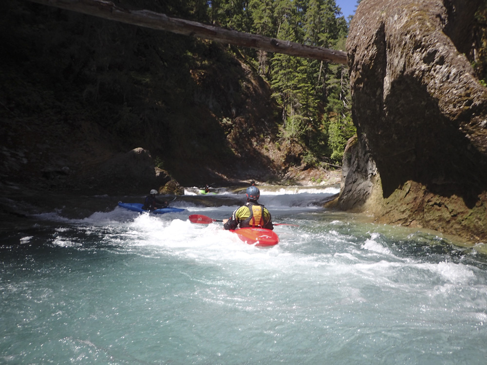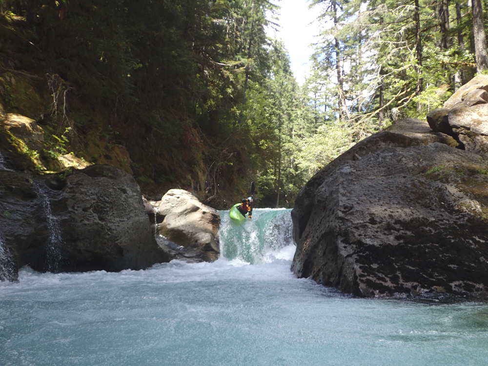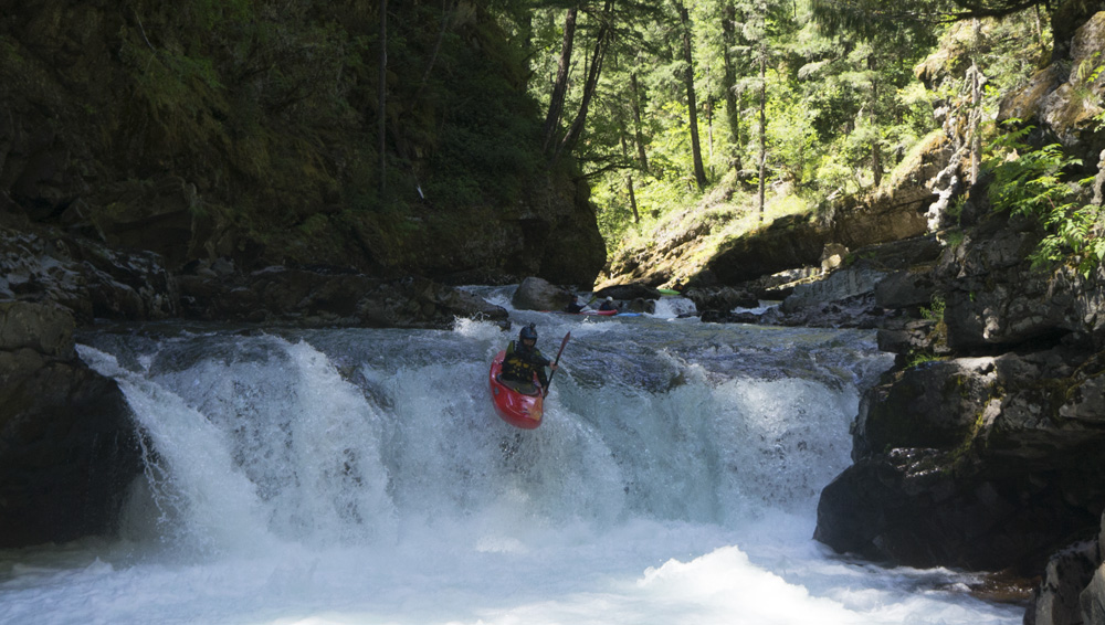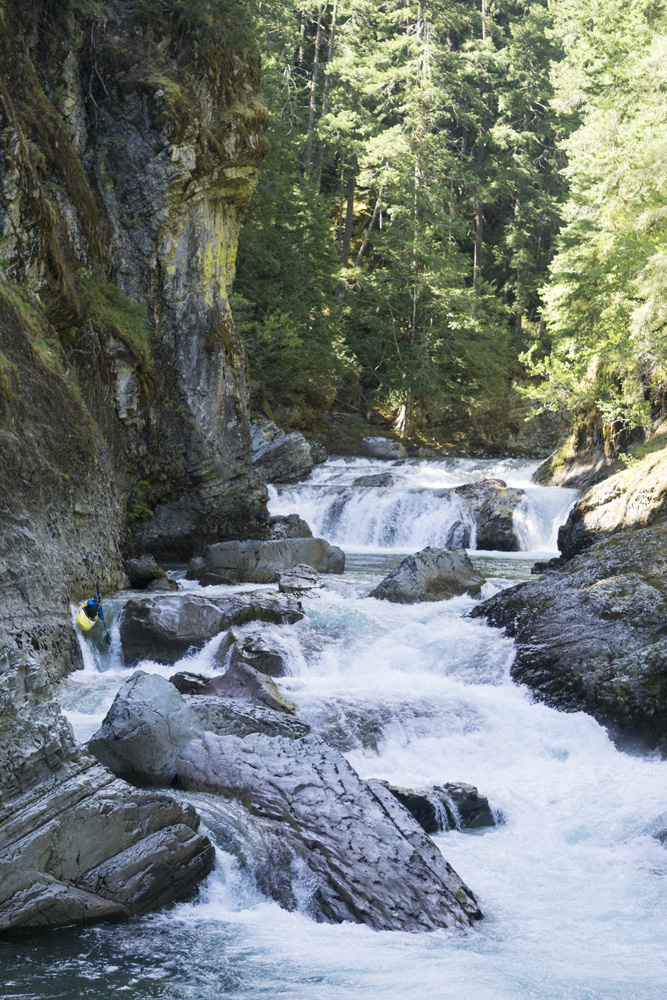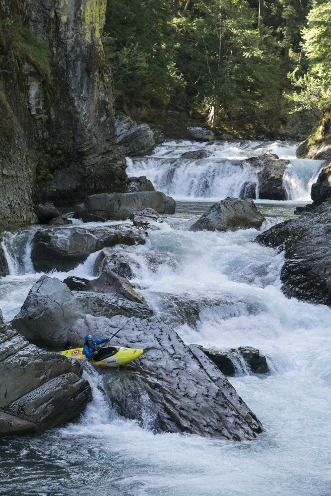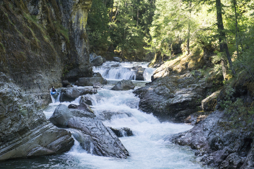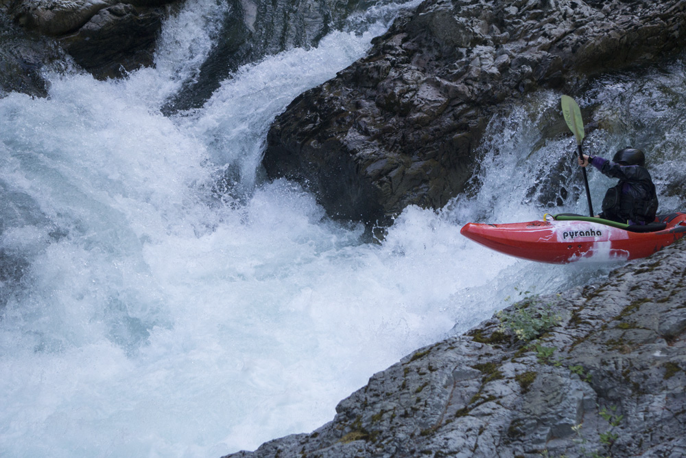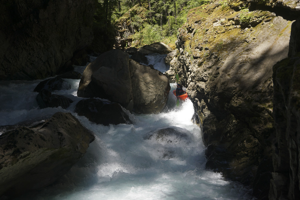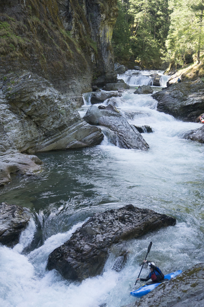 Once on the run, you run a few tight and powerful rapids before the river then opens up a little. The lull is short lived though as you quickly find yourself boofing off a log into another canyon which has several nice rapids and several rapids you need to sneak or run in proper channels to avoid dangerous spots. It was very helpful having locals with us, Nicole and Jordan, who knew the lines as this saved all sorts of scouting time allowing us to run almost everything on beta. A ways down, you get to the one bigger and more dangerous rapid, Elbow Room. Scout and portage on the left or run it down the left of the large midstream rock. A little ways further you get to the falls that this run is best known for. Run the meat on the left or sneak down the center. Below is a powerful rapid that has different lines which are flow dependent and either require punching two big holes or flirting with a big sieve. The run opens up not far below.