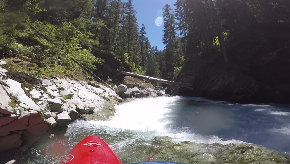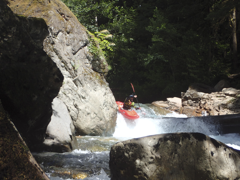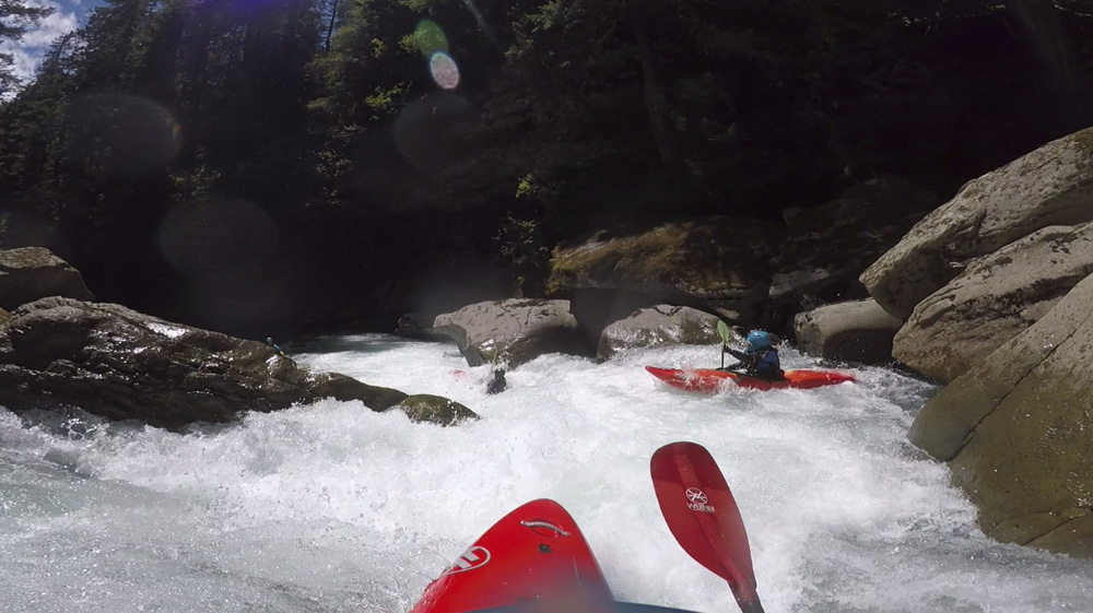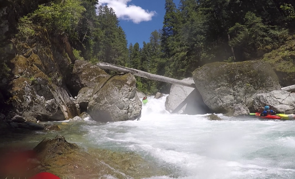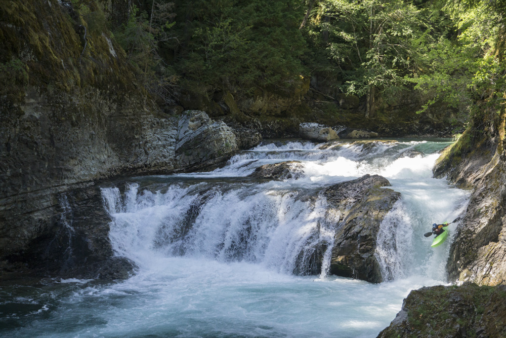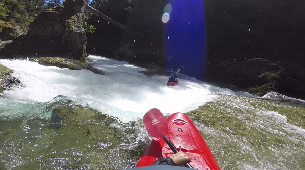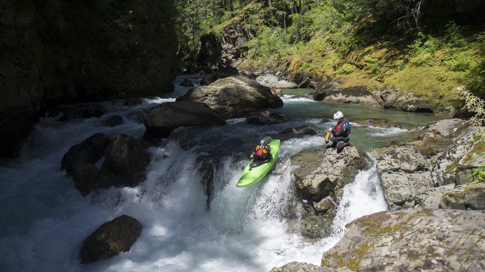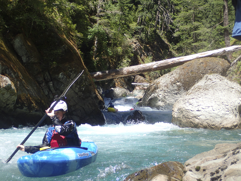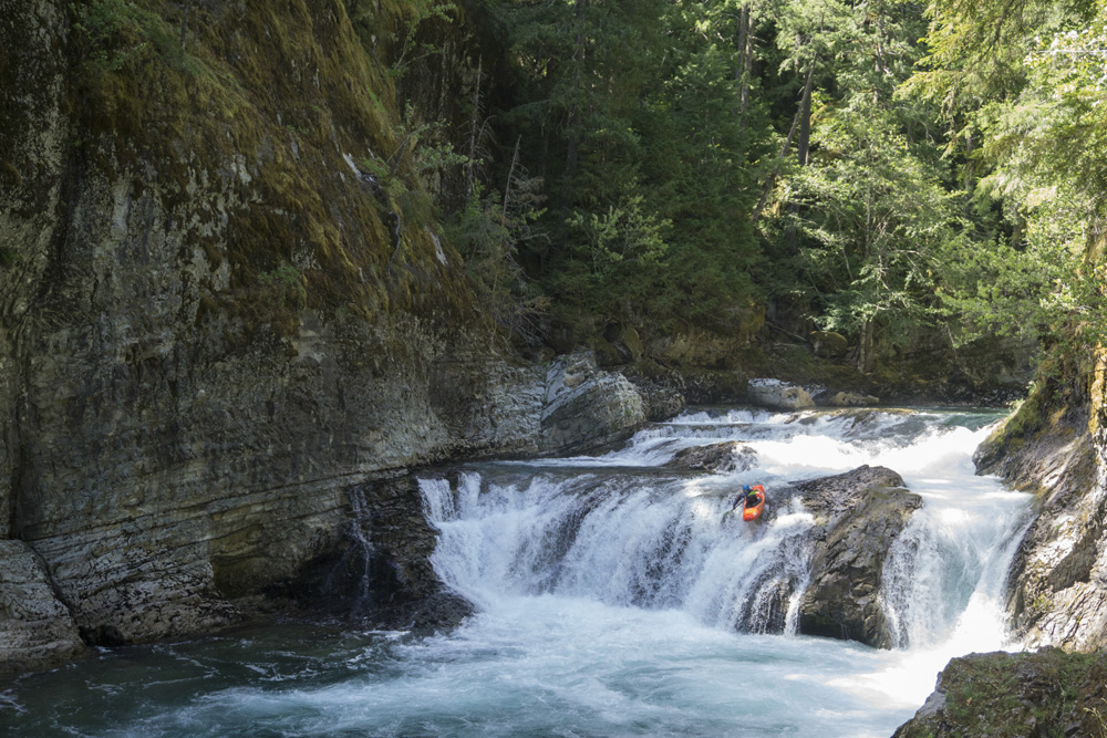Once on the run, you run a few tight and powerful rapids before the river then opens up a little. The lull is short lived though as you quickly find yourself boofing off a log into another canyon which has several nice rapids and several rapids you need to sneak or run in proper channels to avoid dangerous spots. It was very helpful having locals with us, Nicole and Jordan, who knew the lines as this saved all sorts of scouting time allowing us to run almost everything on beta. A ways down, you get to the one bigger and more dangerous rapid, Elbow Room. Scout and portage on the left or run it down the left of the large midstream rock. A little ways further you get to the falls that this run is best known for. Run the meat on the left or sneak down the center. Below is a powerful rapid that has different lines which are flow dependent and either require punching two big holes or flirting with a big sieve. The run opens up not far below.