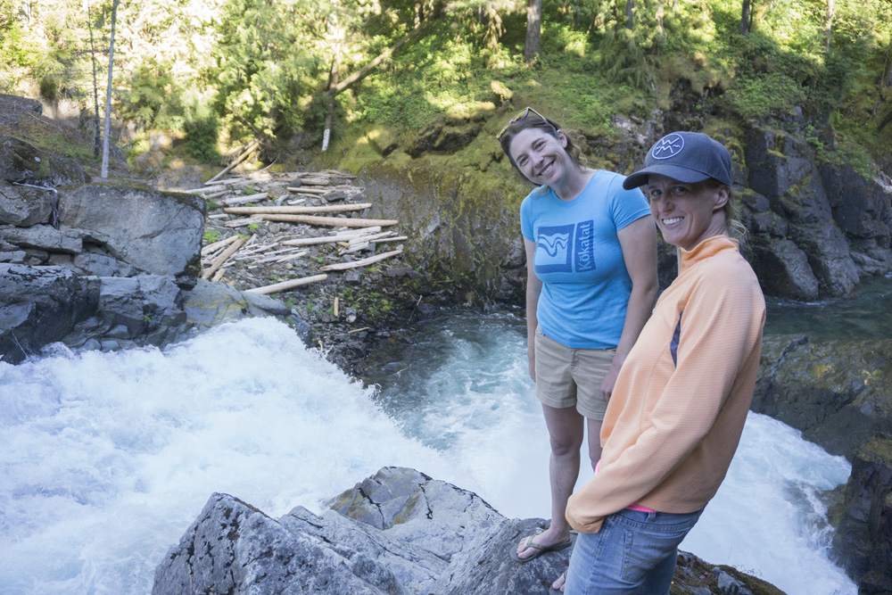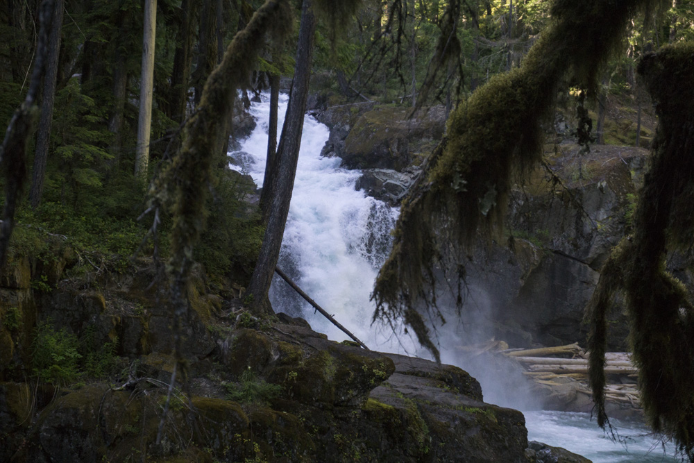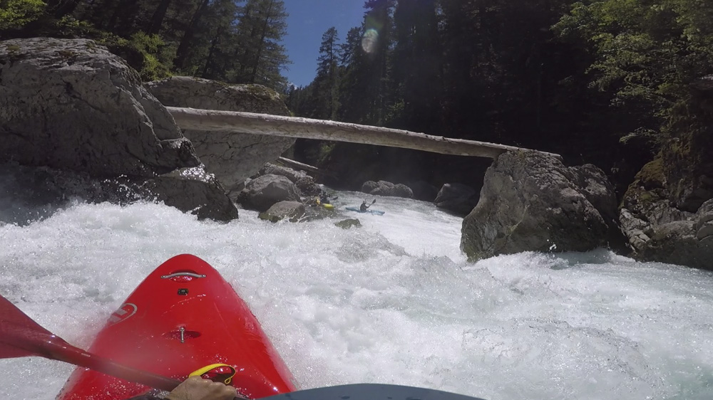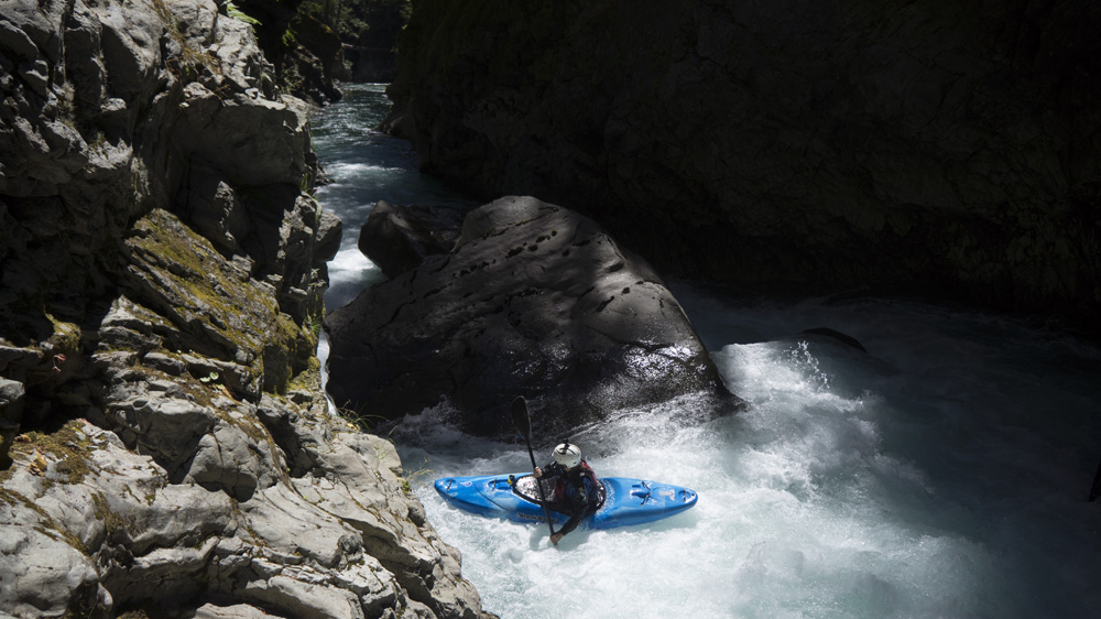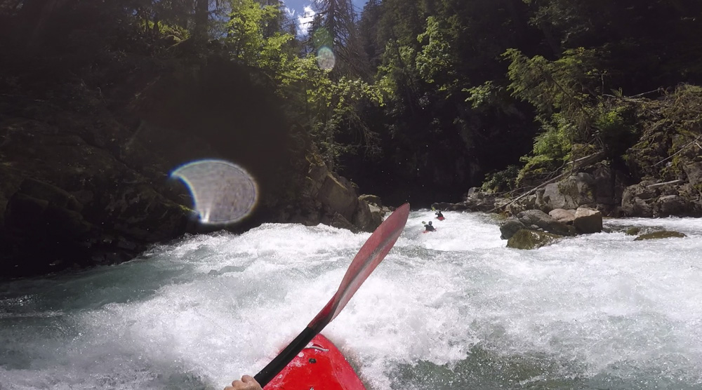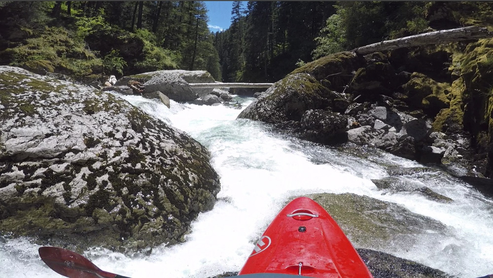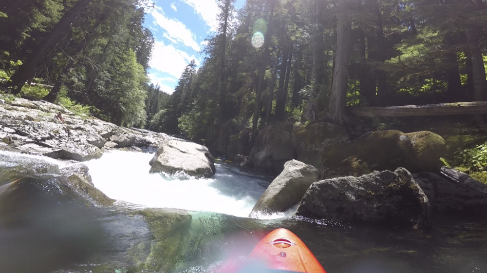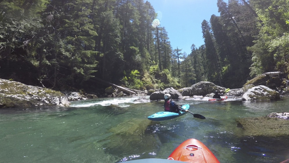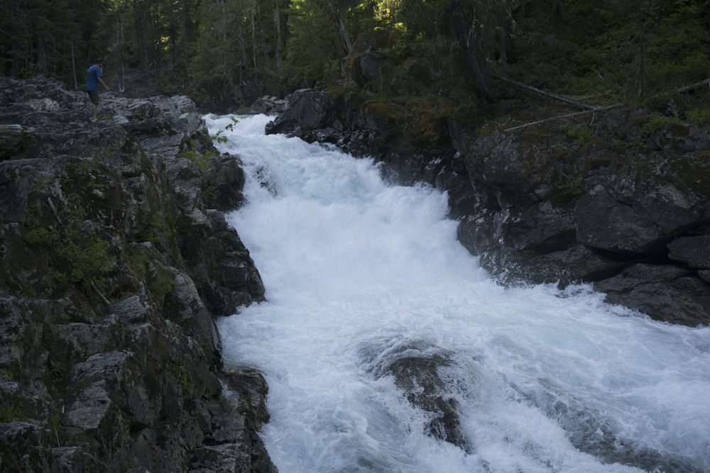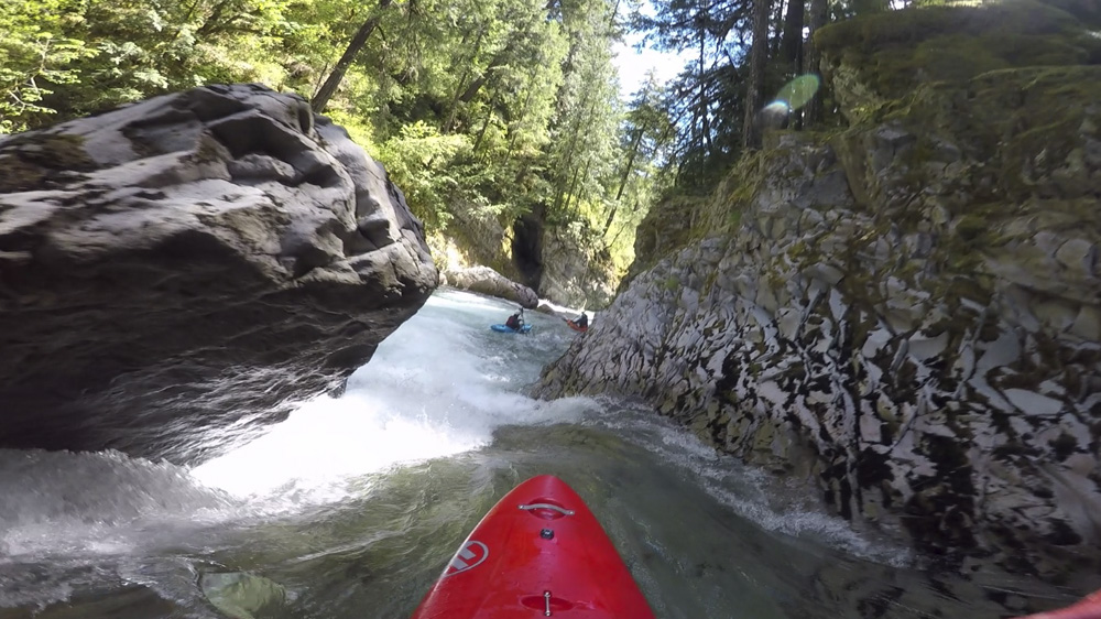 Once on the run, you run a few tight and powerful rapids before the river then opens up a little. The lull is short lived though as you quickly find yourself boofing off a log into another canyon which has several nice rapids and several rapids you need to sneak or run in proper channels to avoid dangerous spots. It was very helpful having locals with us, Nicole and Jordan, who knew the lines as this saved all sorts of scouting time allowing us to run almost everything on beta. A ways down, you get to the one bigger and more dangerous rapid, Elbow Room. Scout and portage on the left or run it down the left of the large midstream rock. A little ways further you get to the falls that this run is best known for. Run the meat on the left or sneak down the center. Below is a powerful rapid that has different lines which are flow dependent and either require punching two big holes or flirting with a big sieve. The run opens up not far below.
