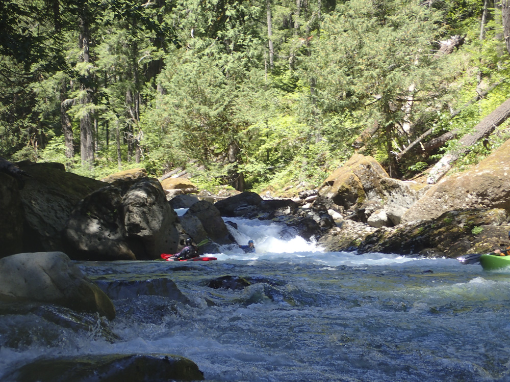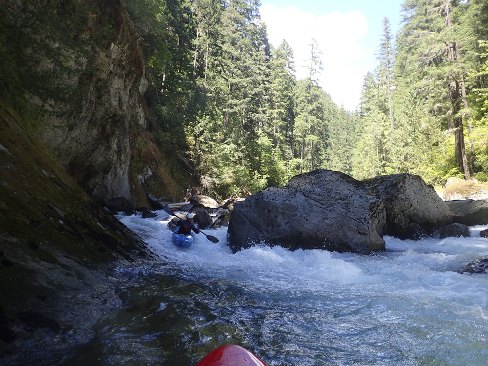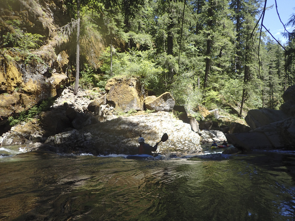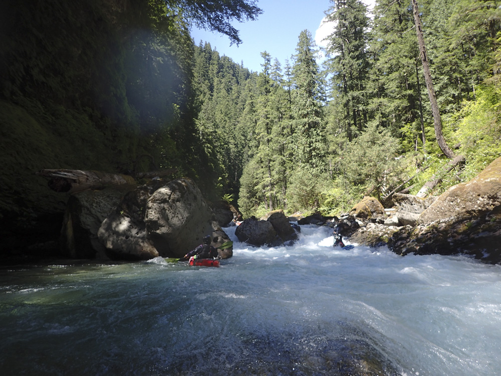 - Elbow Room (V). The biggest rapid on the run, this one commonly is walked. We banged down some entrance stuff on the far left to get to an eddy at the lip. Scout on the left. The entrance is a 5 foot tall ledge, boof it and land coming back to the left. Now, stay off the left wall but punch the two holes to keep driving left into the pinch slot. From there, you are clear. The hazard is that the big rock in the middle of the river is massively undercut on the right side with most of the channel flowing under the rock. So that is why you stay left throughout. The walk is back upstream a small ways on the left to get above the cliff band and then walk back down below the cliff band.