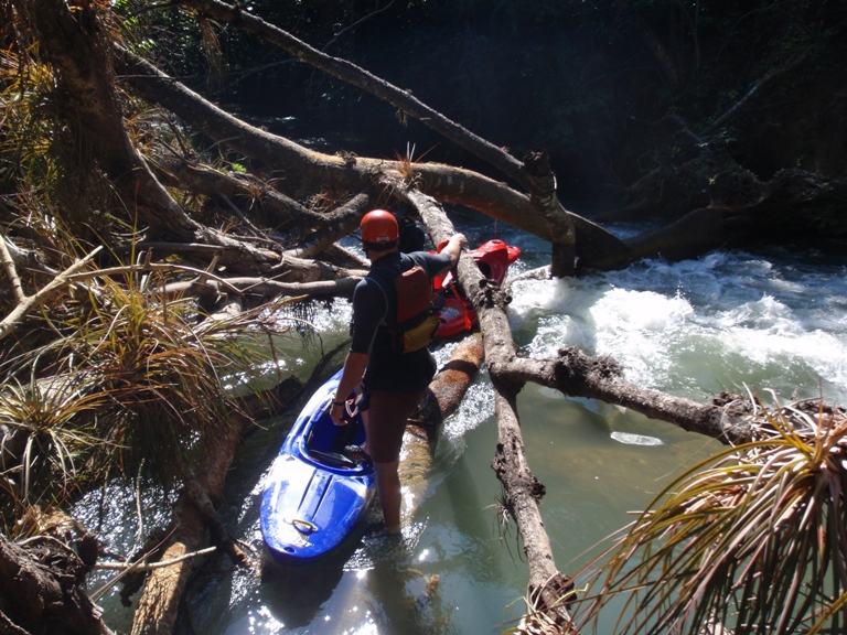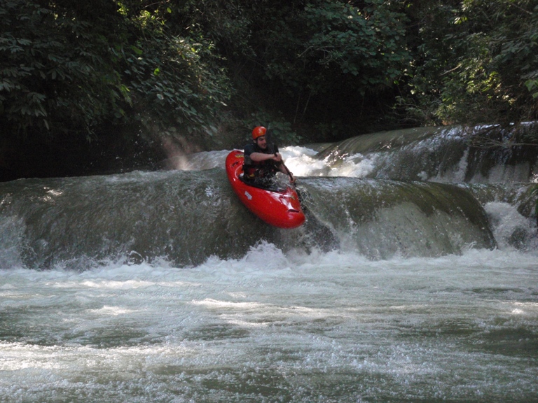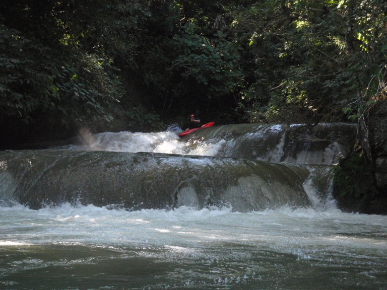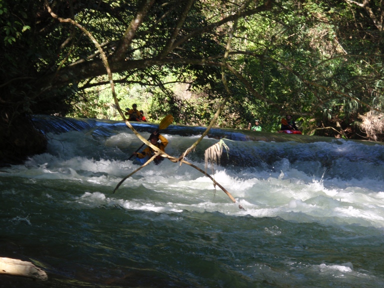 The Ojo Frio was the biggest disappointment of our trip to Mexico. There was limited amount of beta online or in the guidebook. Somewhere we found mention of 100 3-4 foot drops along with a couple of larger rapids. This coupled with the gradient of 110 ft/mile made this run seem like an awesome option. After an easy drive (30 minutes to take-out) from the Agua Azul Ranch we found take-out and began to be baffled. At this point we had run the Santa Maria, Tampaon, Salto and Micos sections of river and all of them were among the most beautiful places we had ever seen. At take-out for the Ojo Frio you come to the crashing reality, no place is paradise and that Mexico isn't perfect whitewater all the time. The river runs through Sugar cane fields and ends in the middle of the small town of Damian Carmona. The water is vastly dirtier that that of the aforementioned river. To this point I had been paranoid about ingesting water on the previous runs, after the Ojo Frio I was significantly less worried about those waters. The Ojo Frio's water is a mucky brownish (at least it was on our day), stank, was full of downed trees (one of which required a portage), had copious amounts of garbage floating in it, and is also reportedly full of bad snakes and even crocodiles. Although we didn't see any snakes or crocs (we did see a bumpy thing surface on the Tampaon to which Chezo declared "that was no fish." This was before we read online that they have some crocodiles down here). We did however hear rustling in the shoreline bush followed by a flop into the water, that was enough to encourage not swimming.