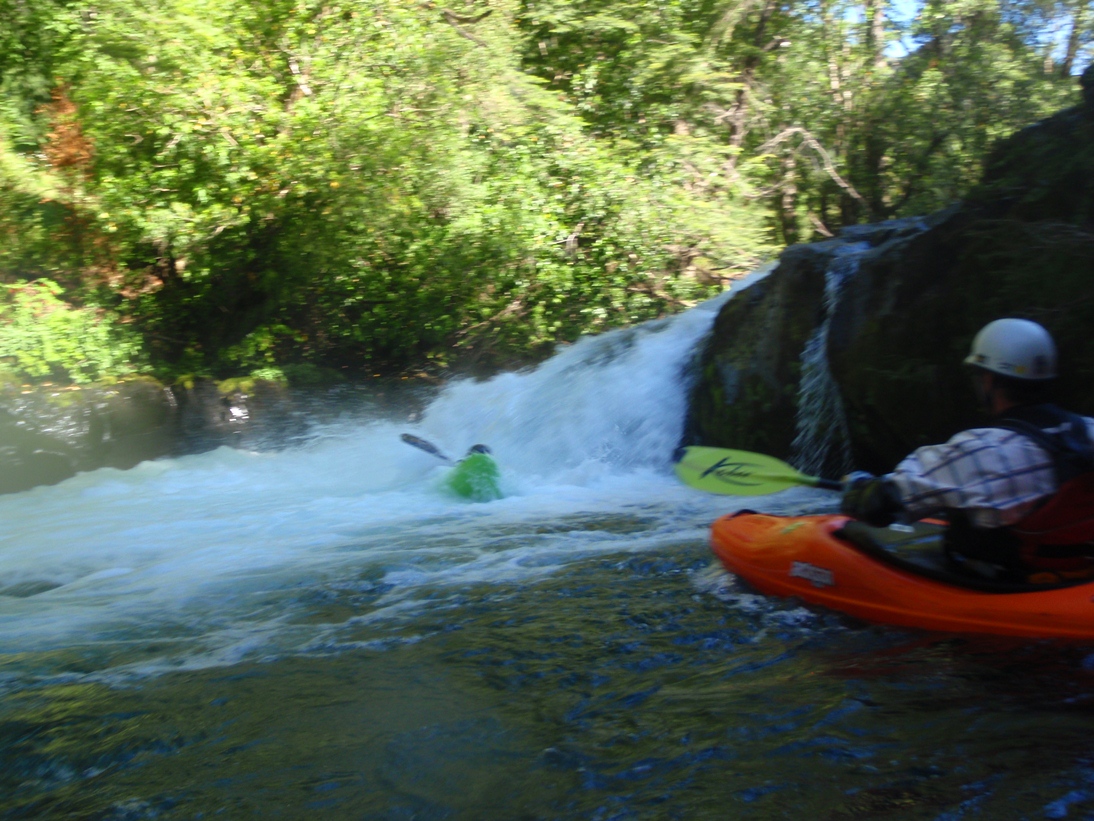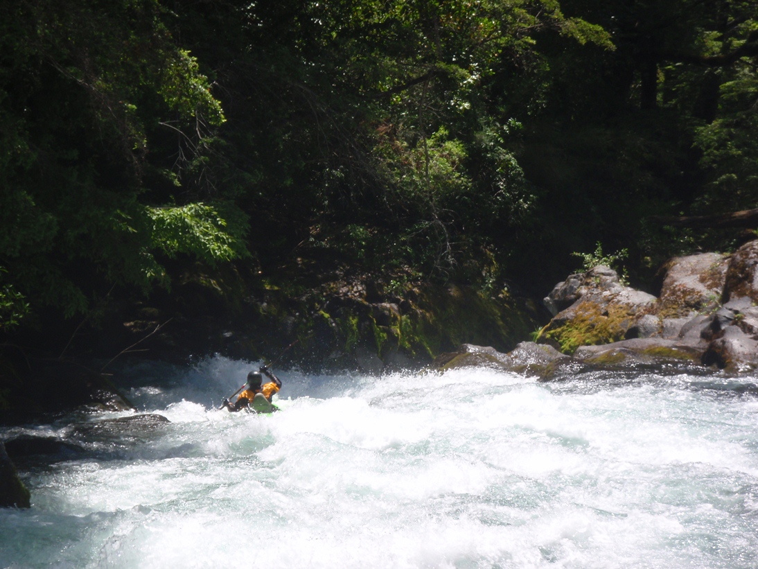 The Lower Palguin is probably the least run section of the Palguin (or at least so it seems to me). The character is not one of waterfalls, but rather of rapids with only two small drops that could be characterized as waterfalls. The runs starts off with class II boogie leading to the first ledge at which you want to be far left to avoid a cave. More boogie leads down to the most serious rapid (portage not included) on the run. A tricky lead in feeds a hole which flushes into a narrow corridor with undercuts on either side. I found out the hard way that it isn't fun to flip at the top and get stuffed in one of these undercuts. At the end of the corridor there is a small ledge hole with a good size hole awaiting. Slack water then bends around the corner and a 8 foot falls with large hole awaits you. Downstream two small rapids lead to a rapid that is no longer run out of respect for Brennan Guth who was swept into the cave downstream in 2001 and passed away (Account of the Accident). Below that one more slide to kicker awaits before the final class II boogie leads to the take-out bridge.