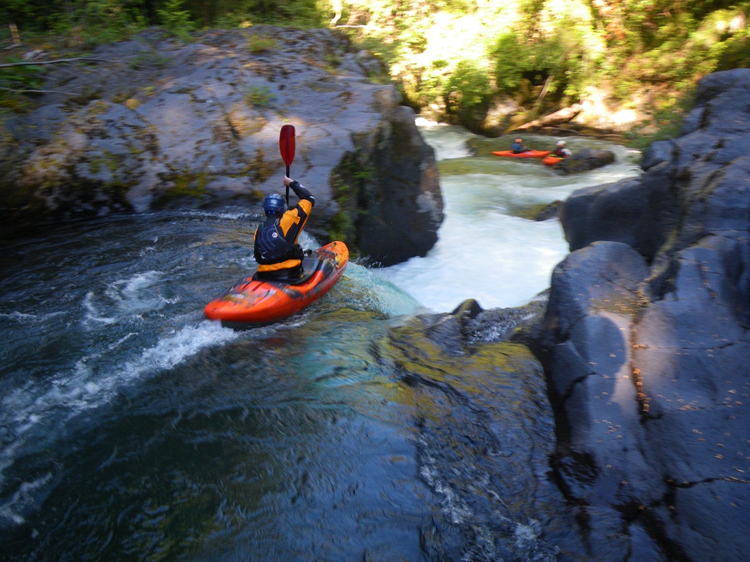Double Undercuts (IV+ to V-). A long class II lead-in leads you to the crux of this run. When you see a bed rock growth on the right short and a small channel going off to your right, it is time to hop out to scout on the right. The entry pushes you left into a curler off the wall and into a hole, from which it flushes downstream into an undercut on the left and right. Once clear of the undercuts, boof the final hole blocking the mini gorge. It is a good place for safety because a short falls with powerful hole await just 50 feet below the exit hole.