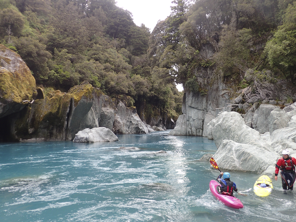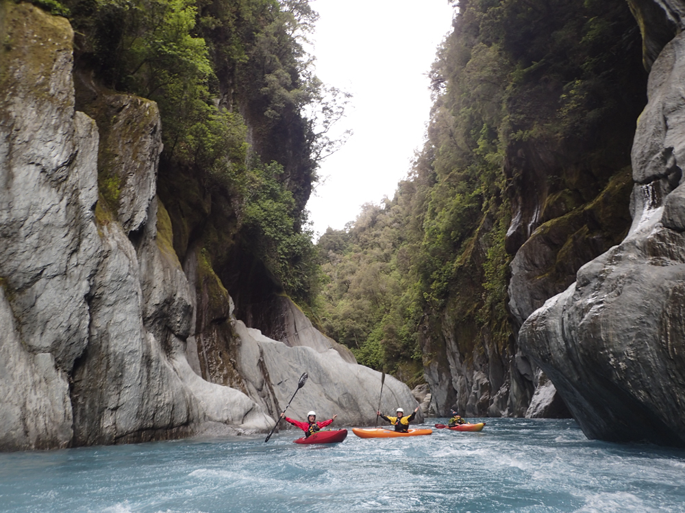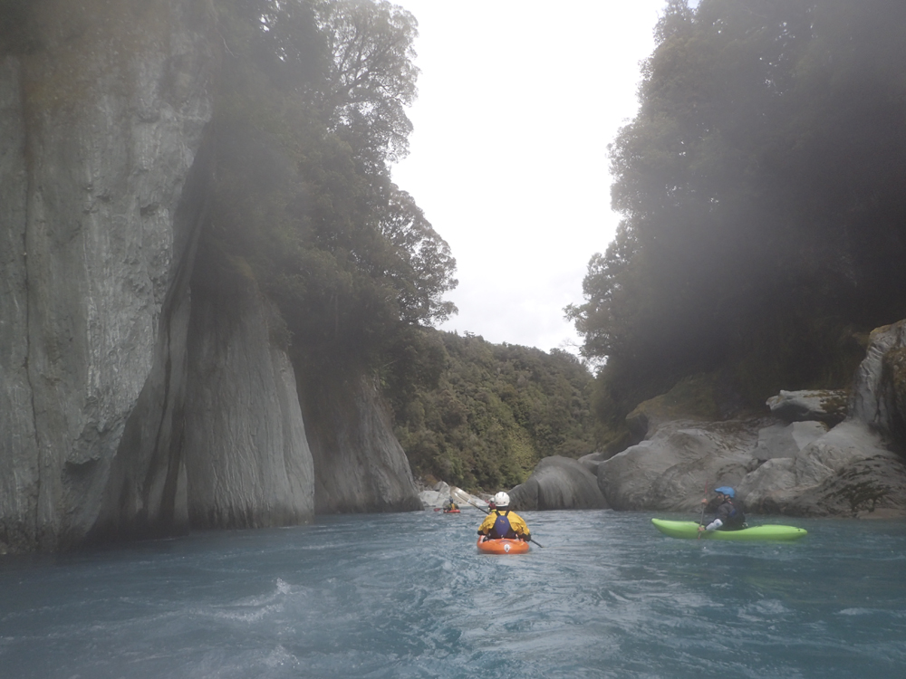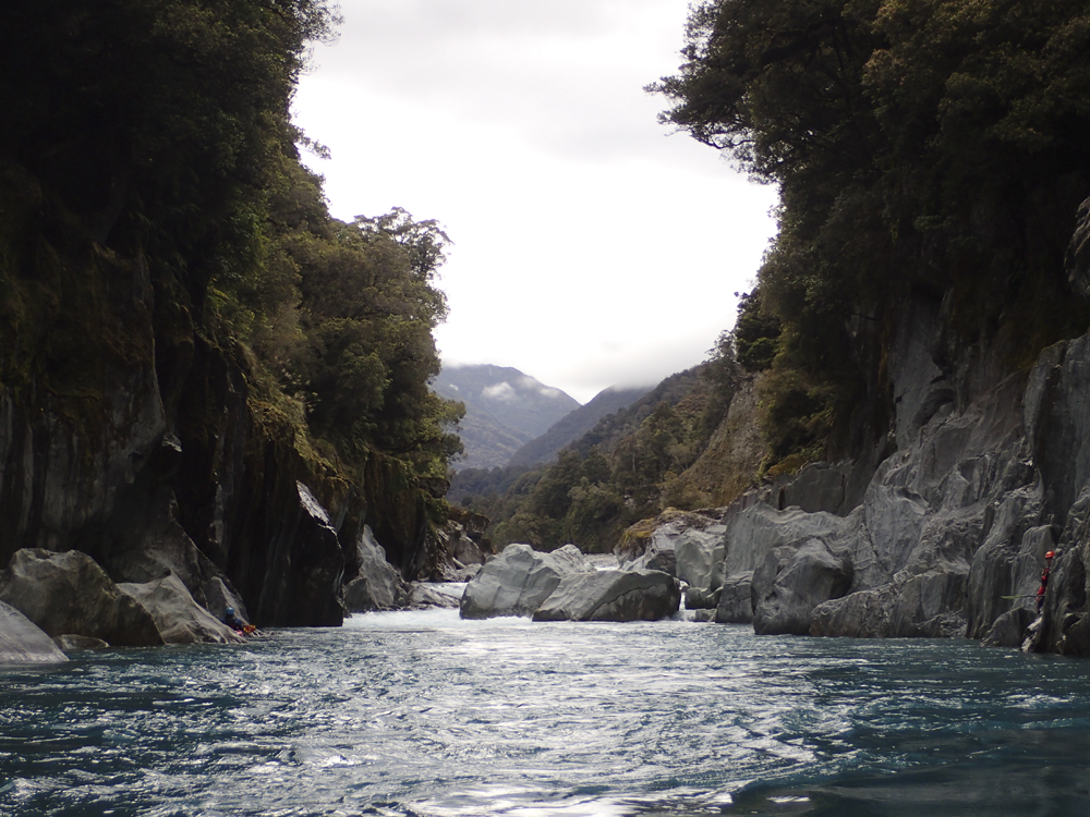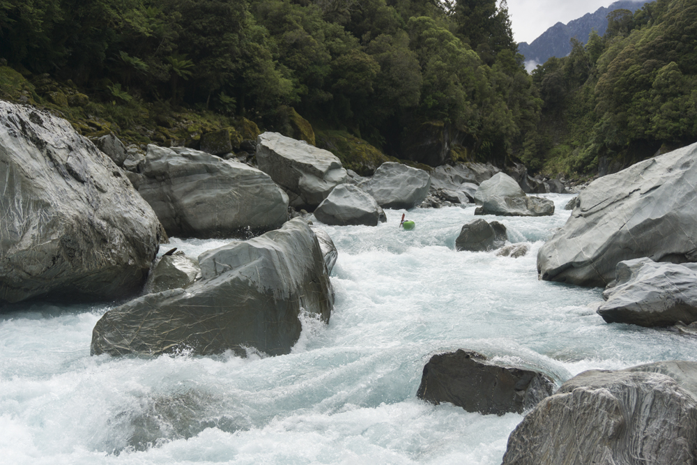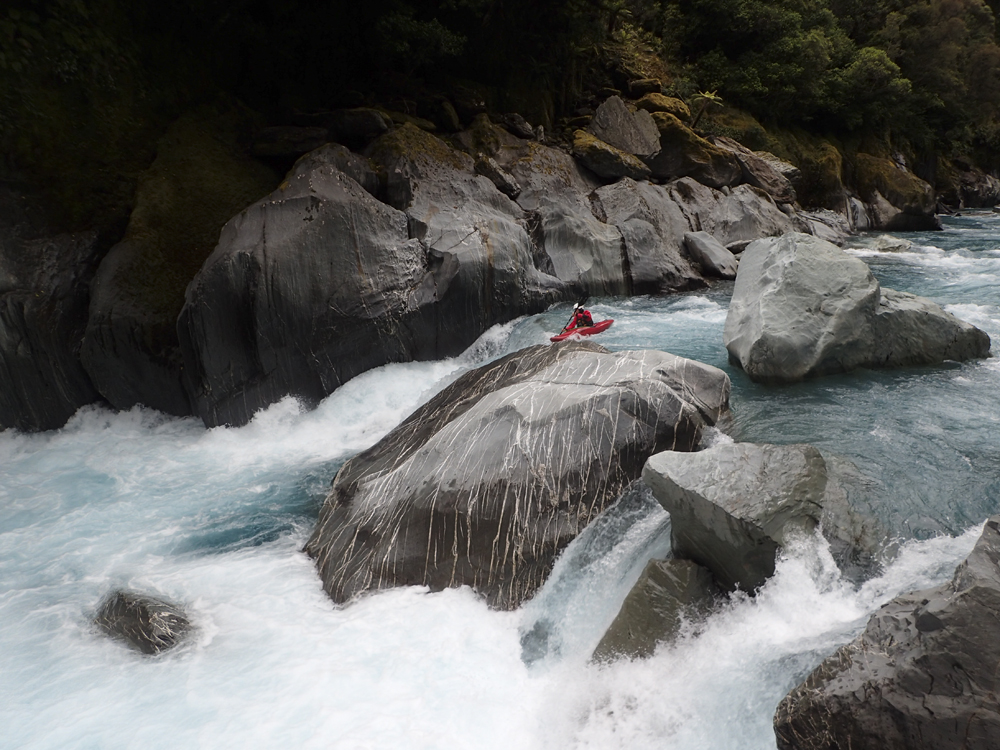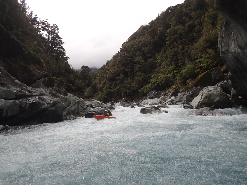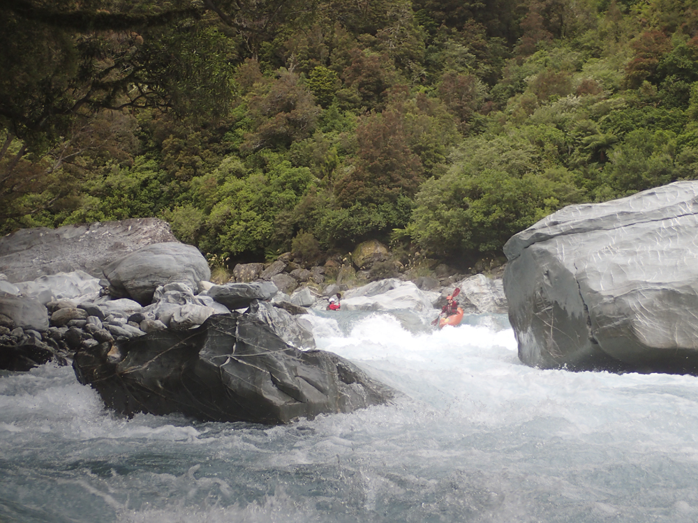 I am going to start with the same paragraph from the upstream Scone Hutt write-up. I am sure I will catch a world of grief for breaking this into two runs, so I am going to start with my rational for it. I was very surprised on my trip, how many people make New Zealand a class IV destination. I always pictured it in my head as a solid class V destination and because of that was afraid to come here for years (due to the sieves of course). But little did I know that the class IV is not only plentiful but also quality. And on the Perth, we had half of our group as only class IV boaters who flew into the lower put-in and got to enjoy a few hours of classic paddling as well as the prettiest of the gorges on the Perth. So, rather than leaving these options as a footnote in the guidebook, I wanted to bring more attention to it, so that more people can enjoy these runs. OK, so with that out of the way... So, after paddling down from the Scone Hutt section we were relieved to see our friends on the shore downstream a few more rapids. The endless scouting that we had experienced was hopefully going to end! Once at the top of the island that marks the Five Fingers drop-off (actually a kilometer downriver of Five Fingers Creeks) the boating was quite fun and cruisy. There were some boulder gardens that I am sure change yearly, and were in the class IV range. After a few of these though, the river mellowed to be class II to III down into the valley. We camped at the end of the valley at Nolan's Hut after maybe 30-45 minutes of paddling on this section. The Hut is a smaller one and only has beds for 4 people, we planned ahead though and brought tents in with us. The hut system in New Zealand is pretty awesome. The helicopters will drop your gear at them so you don't have to kayak a loaded boat for the first day, and there are typically things like propane tanks there, also usually an ax to accompany the fire place. Not bad on a cold day and at this point some 5 hours spent paddling, that is for sure! The next day we quickly got to the final gorge, which was the most spectacular from Scone Hut down. It was schist walls with super fun class III to IV rapids between the walls. Portaging is possible, though not always easy. The friends of ours that flew in just for this lower section scouted several of the rapids as they tended to be multi-move and not without consequence. There is one single-move rapid near the end of the gorge that is flow dependent which is an obvious horizon line, scout on the left. Downstream, the gorge walls open and fun rapids continue for a short ways before you bend left and drop into the Whataroa and begin your mellow float back out to your cars. I really wanted to break this run apart from the upstream counterparts because of how worthwhile I think it is, and how attainable it is for so many boaters. There is nothing more than class IV in there, and plenty of class III. If you scout a few rapids I think you would get close to 3 hours of boating for your helicopter dollars. Certainly more than flying into the lower Hokitika. And because of that, I would highly recommend this run if you want an adventure but not to bite off the whole Perth.