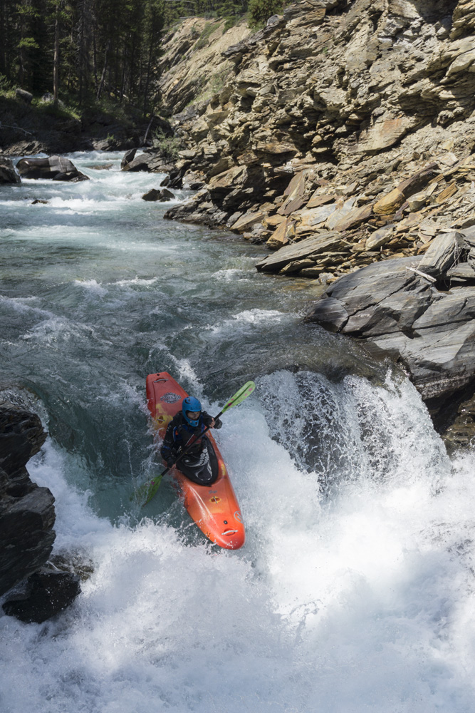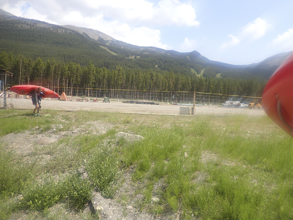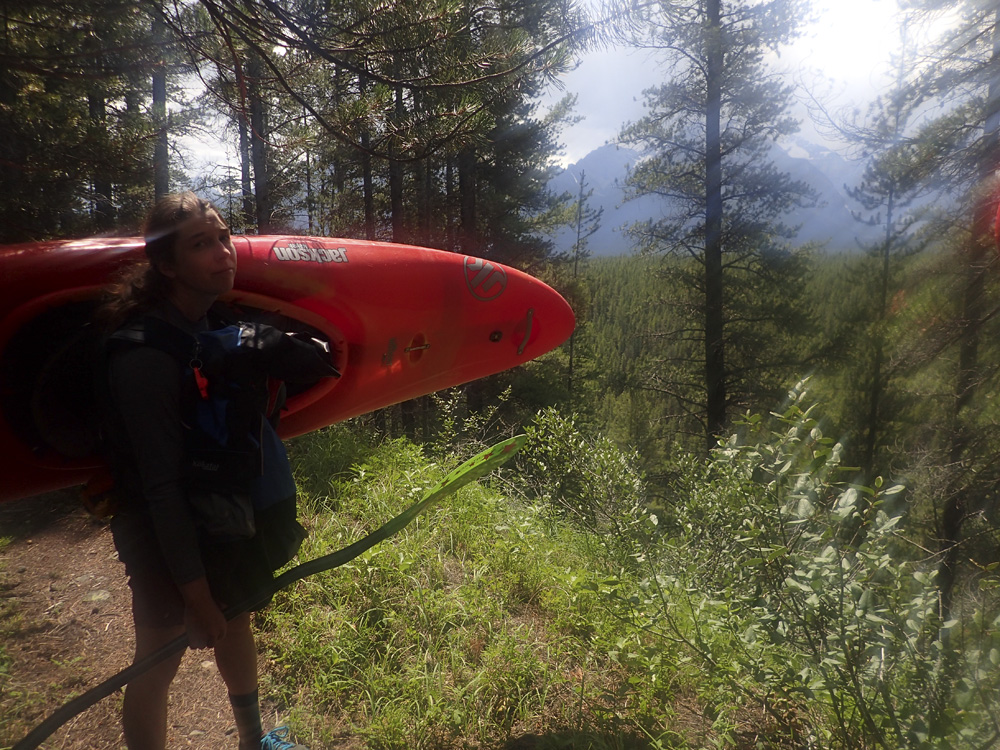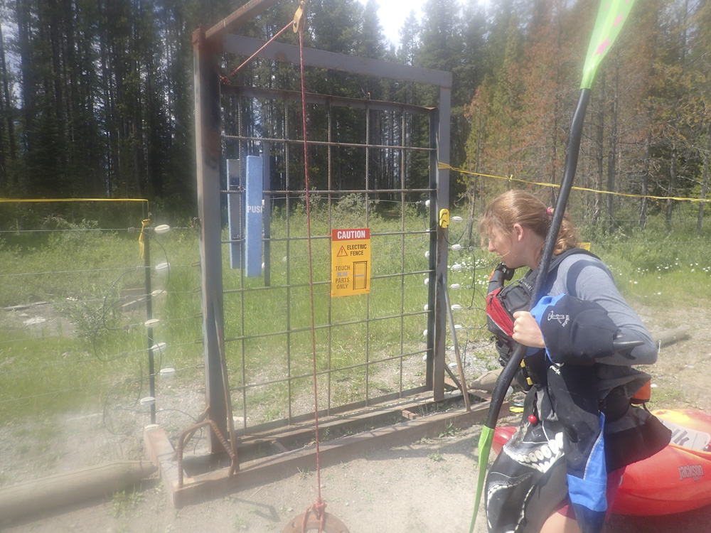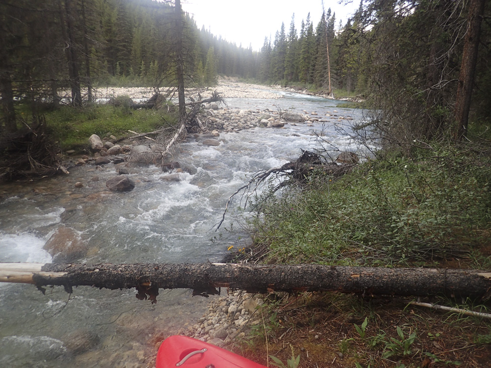 Put-in: From the shopping center, head away from the Bow River, up AB-1A to Lake Louise Ski Resort. As you enter the resort, stay low/left and drive all the way to the back of the parking area. About 100 yards from the back, there is a door in the electrified gate, this access the trail. The trail took about 20 minutes to walk. Follow it until you round a knob to the right, after this a very obvious trail will drop down to the left. This drops steeply to the river, there was a set rope there to help on the slippery slope.