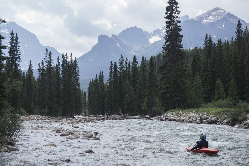 Once on the water our low water was confirmed, but we also found that we had enough water to float and have a good time. Paddling maps stated 10 cumecs is low and we had just under 9, so it was as expected. The river soon channelized and the river became really fun, a few ledges and a few multi move rapids. Before long though, the river eases up and this is where the low water was really noticed, as the river widened and rocks were hit more often. We were still able to float though, and soon, we rounded the bend and got the full Banff mountain scenery to accompany us for the rest of the paddle out down into town.