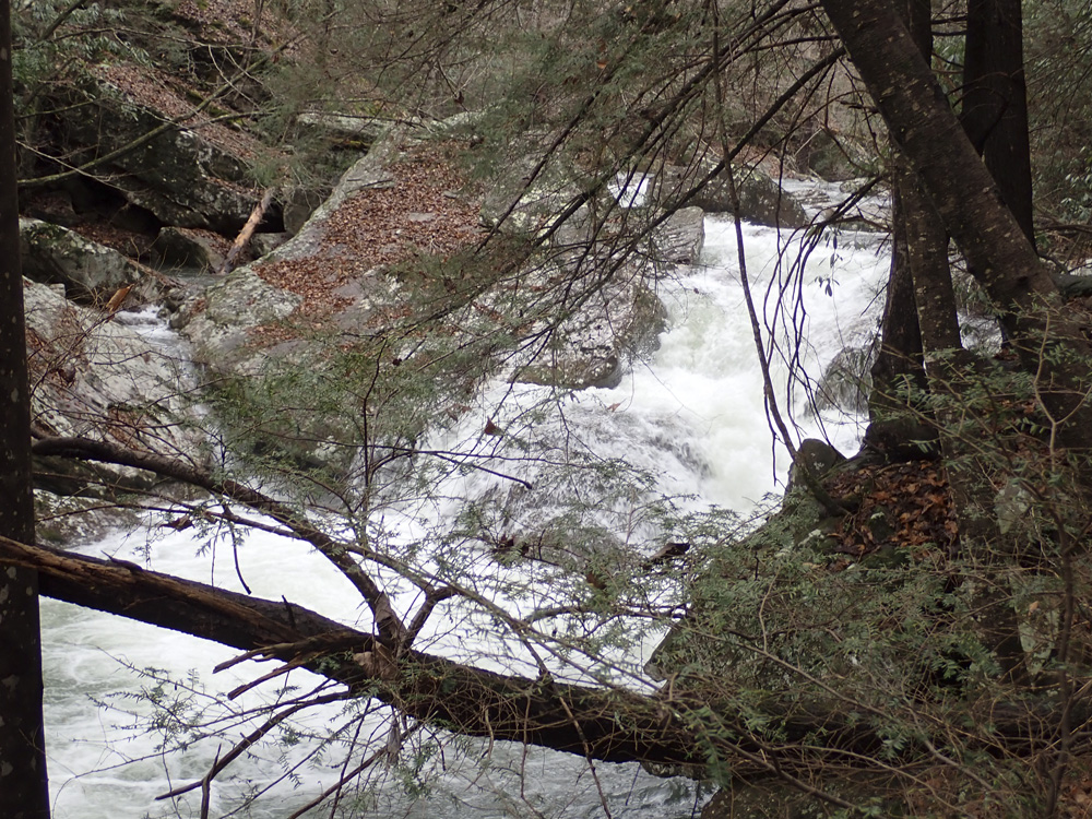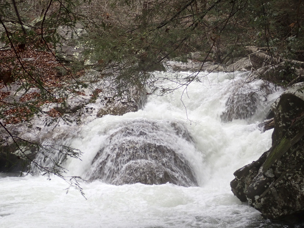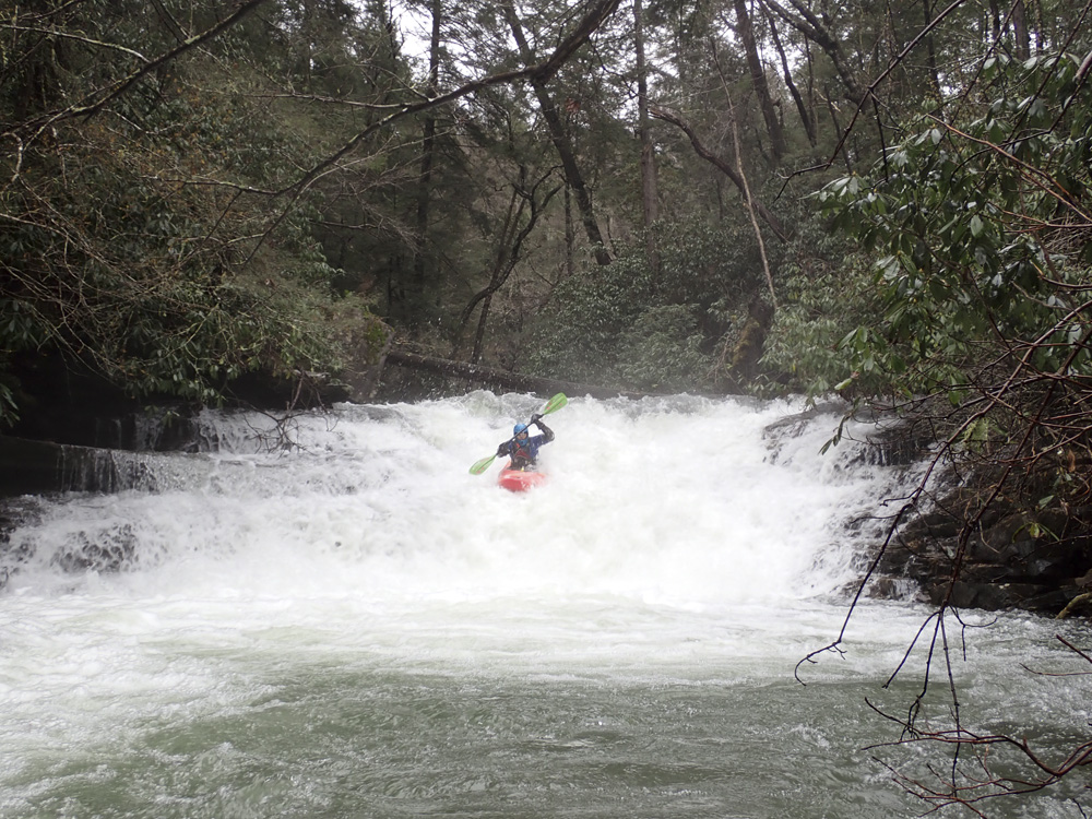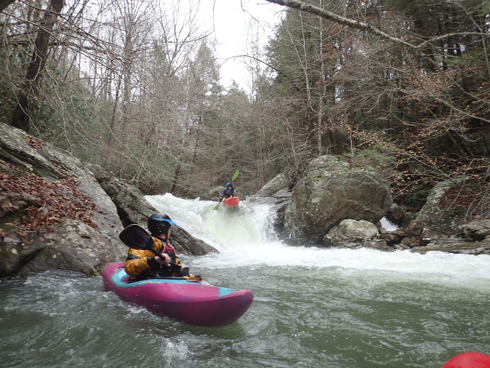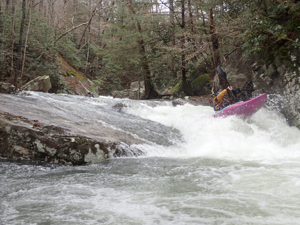 Hot Pocket (IV to IV+). Downstream is the biggest in the bedrock section. This one should be scouted on the left, all the way to the base of the falls at the bottom as it occasionally collects wood. The top is a small s-turning slide, you then want to drive right of center for the middle tier which is a steeper slide. The water wants to go left, but that has overhanging Rhodo. This leads to the final tier which is maybe 12-15 feet tall, non-vertical drop that should be run somewhere left... far left is ok, left of center is ok, mainly just have left angle. The right shore is a bit undercut.