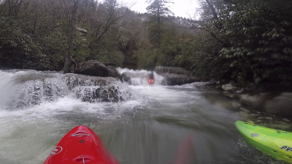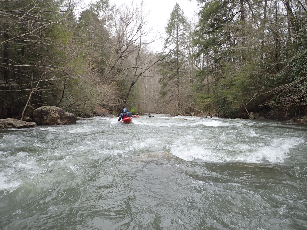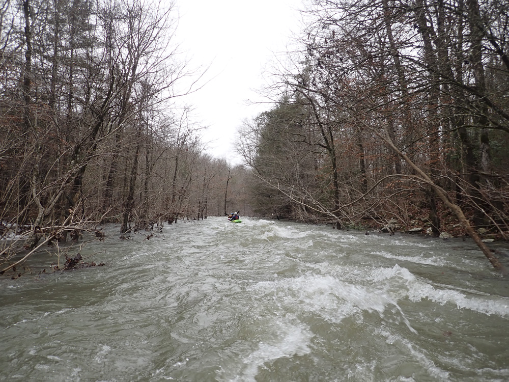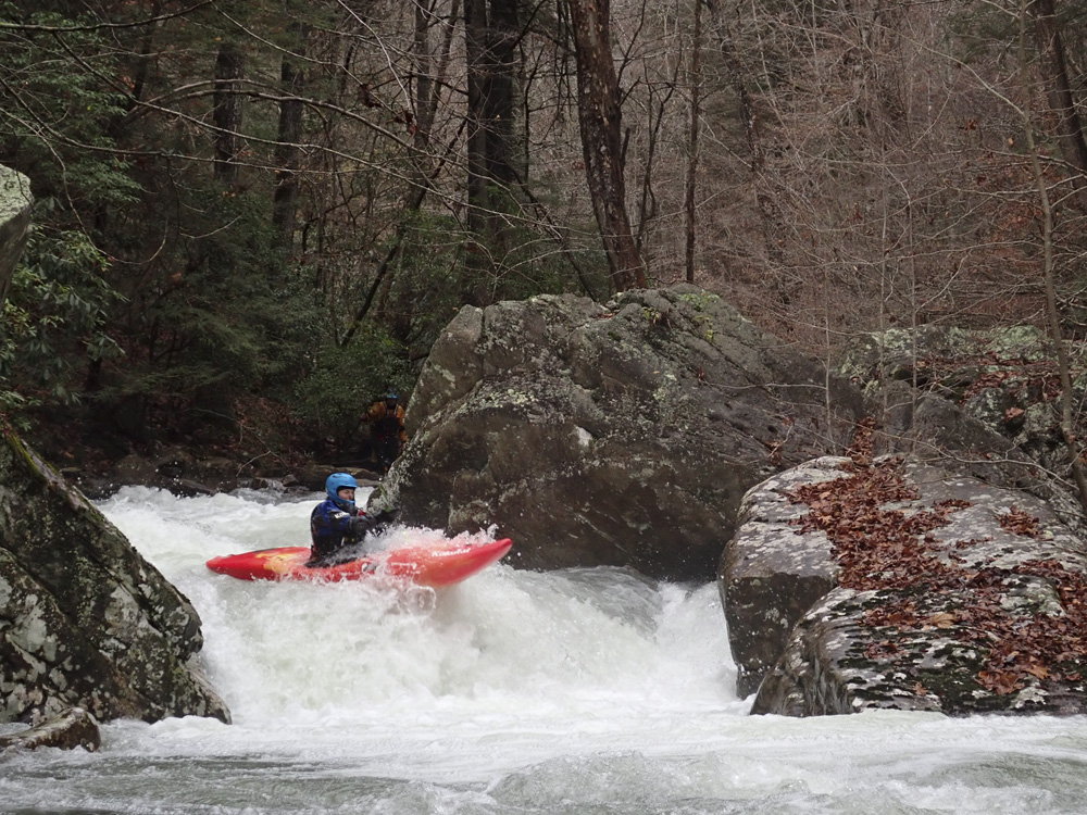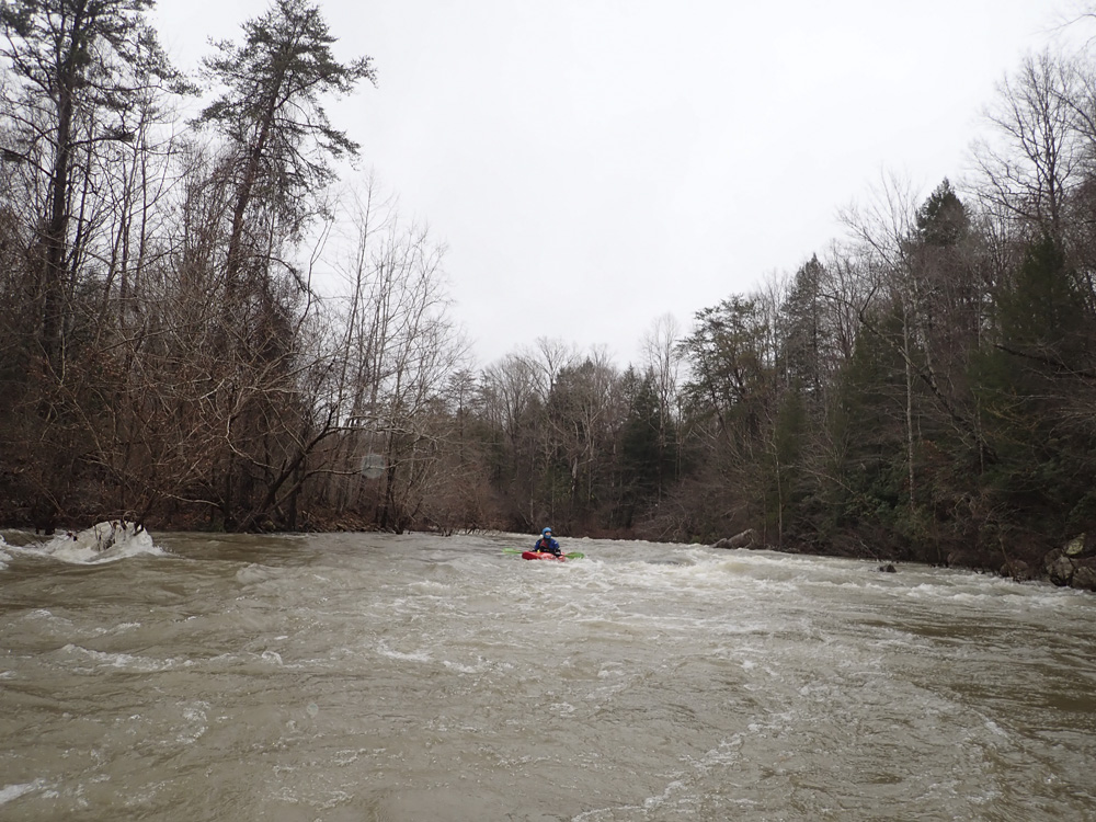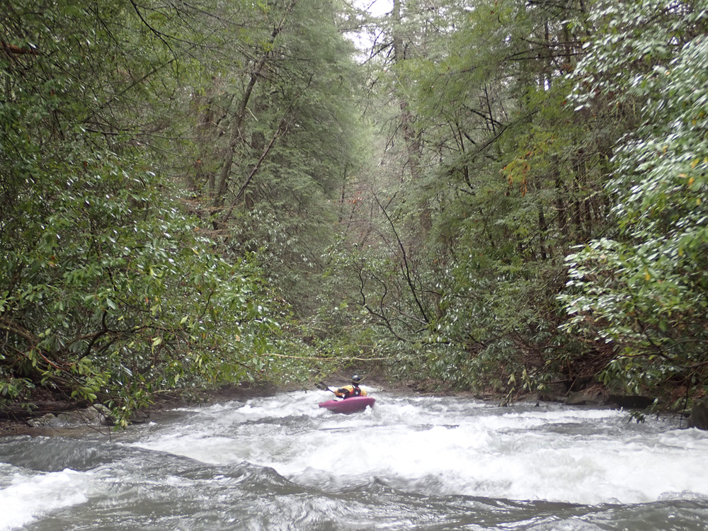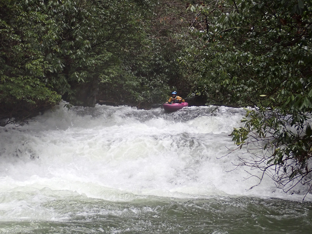 Upper Pocket Pussy (IV to IV+). Scout right. This one has a boof on the right that you want to run with a little left angle. This will help you clear the undercut jutting out on the right in the pinch exit immediately below. I imagine as flows rise, and this small pool before the exit backs up, this one gets some teeth.