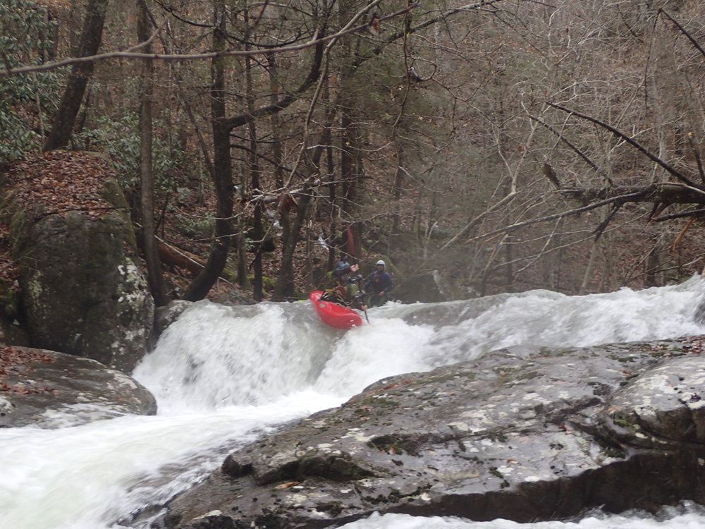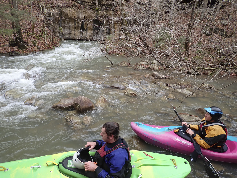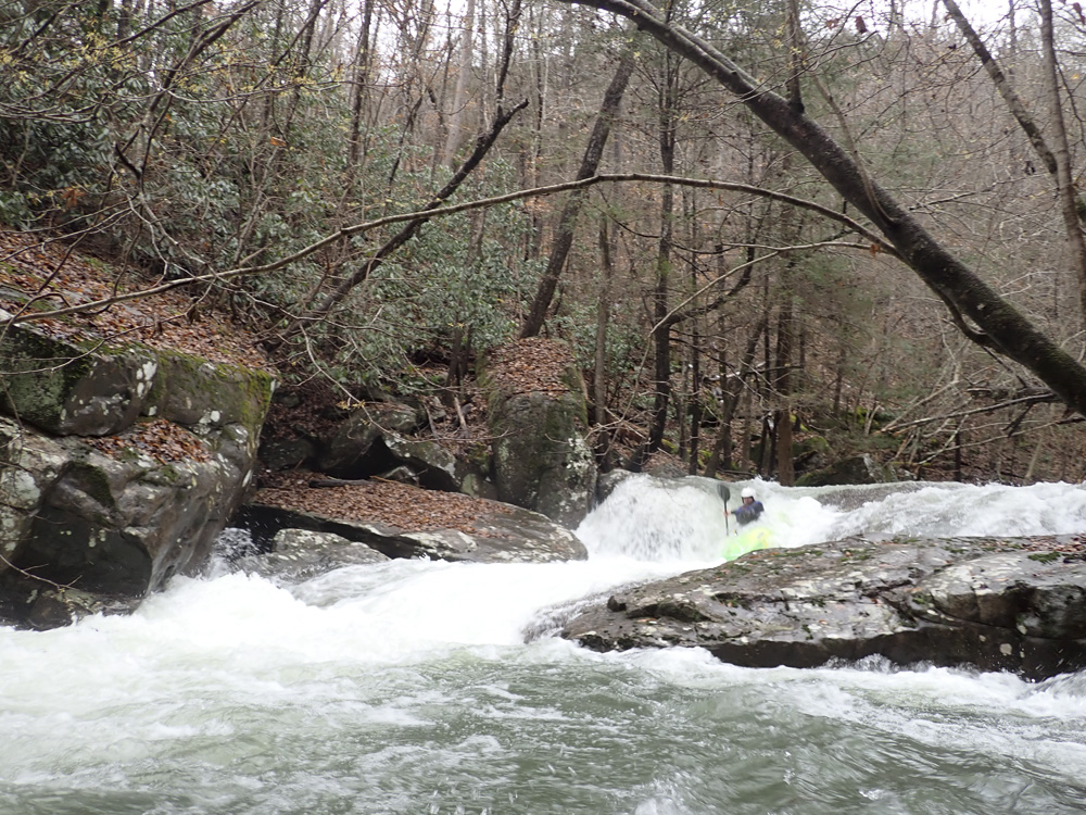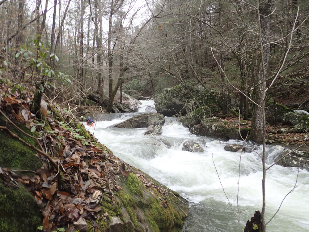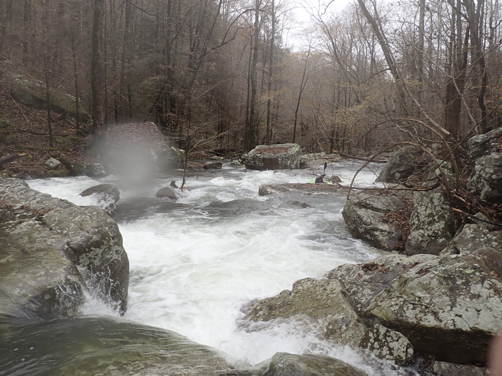 For the record, we had something like 0.6 or 0.7' on the gauge. I felt this was a bit lower than I would have preferred for the bedrock, but was fine for the boulder gardens. I have seen video down to 0.3, dang that must have been low. And I know folks run it at 1.5'... which would be sweet for the bedrock but scary for the boulder gardens. And finally, we had ~2 inches of rain within the 24 hours preceding the trip. My parting thought... going in I had heard that this is one of the best creeks in Tennessee. Kirk has it rated 5-stars. I think that it was good, perhaps with a more ideal flow it would be 5-stars. But, the effort is high. Scouting and portaging in rhoto sucks. If you knew it was clean and could bomb away I think it would be awesome, but it is so seldomly run that you can't do that. So yea. I liked it, but not 5 stars worth. Also, I think at our flow I agree more with AW's rating but can see how Kirk's rating of V could be present at higher flows too.