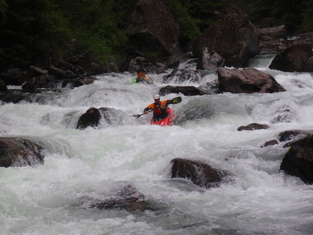 Third Section (IV+ to V-). This section was long and exposed. The river split around a house sized rock. You want to be on the left side. Then, behind the rocks, move right. Now there are apartment sized rocks splitting the river. Take the channel to the right over a steep rocky drop. The run out has two good size holes, both are run down the left. This section I can imagine becomes stout at high flows. At the low flows, the hydraulics all flushed. This is the end of the hard section of whitewater.