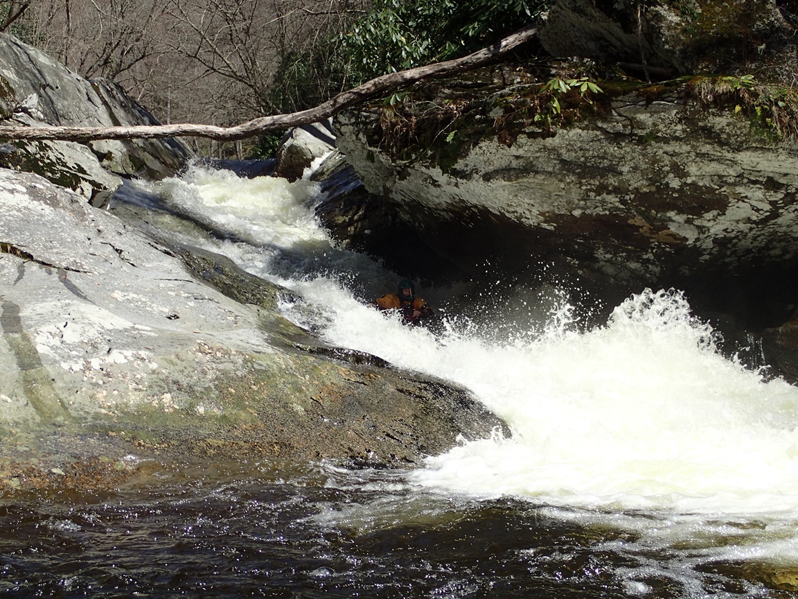 Log Slot (IV). This small 3 foot ledge use to have a log in it to mess with you, when thrown with the undercut on the right and the recirc a lot of swims have occurred here. The log is gone (2015) and the ledge was best run driving left but straightening for the boof. It is pool to pool.