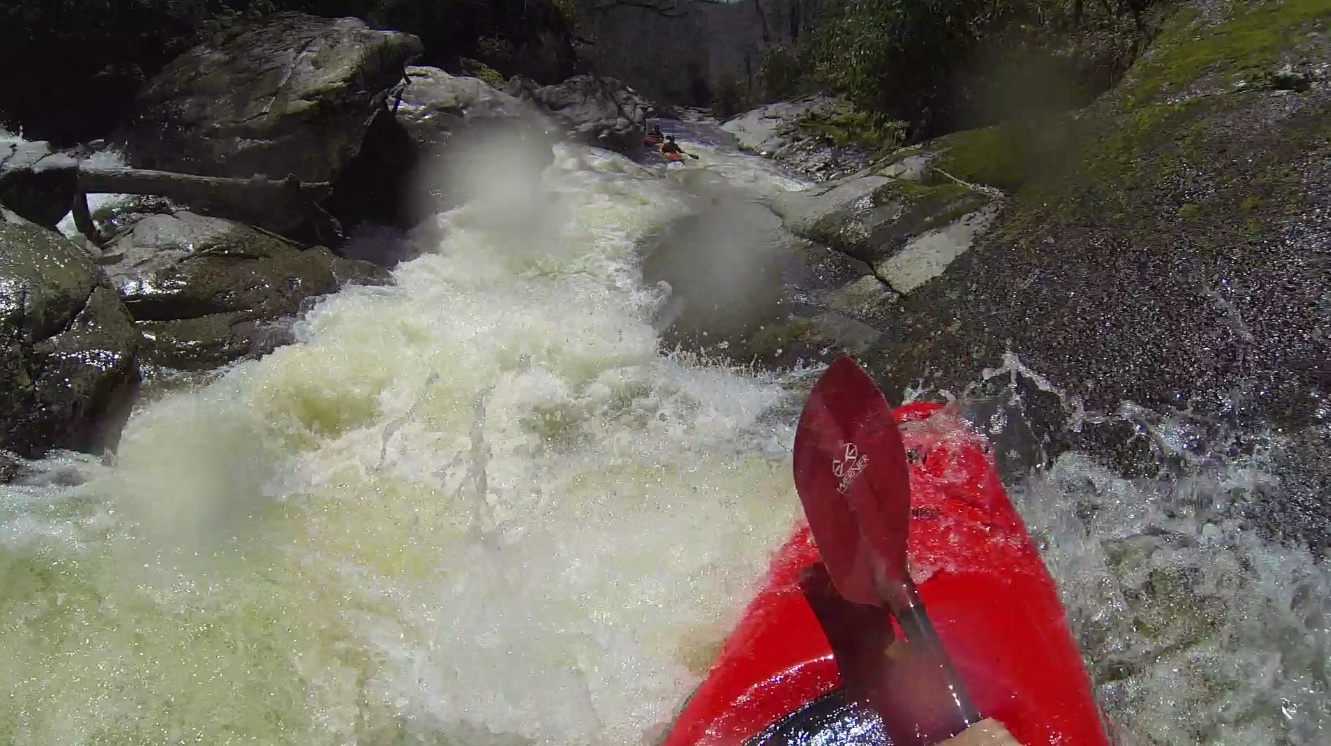 Mike Tyson's Punch-out (V to V+). Put in just below Atomic Elbow Crusher after scouting from above. The line is to enter the small ledges center-ish and then work right through the pinch to hit the great shoulder boof. Too far right though lands on a shallow slab. Below, work right into the shallow slide that then leads you to the corner. Round the corner hugging the inside to stay right on the slide below. Getting too far left leads to a rib of rock to piton or flip on. Staying right also lets you keep you momentum to then drive left across the hole at the lip of the exit 15 foot falls. For the falls, you just don't want to be far right as there are nobs on the wall during the falls and the landing is a little undercut. This rapid really does boat much easier than it looks like it will!