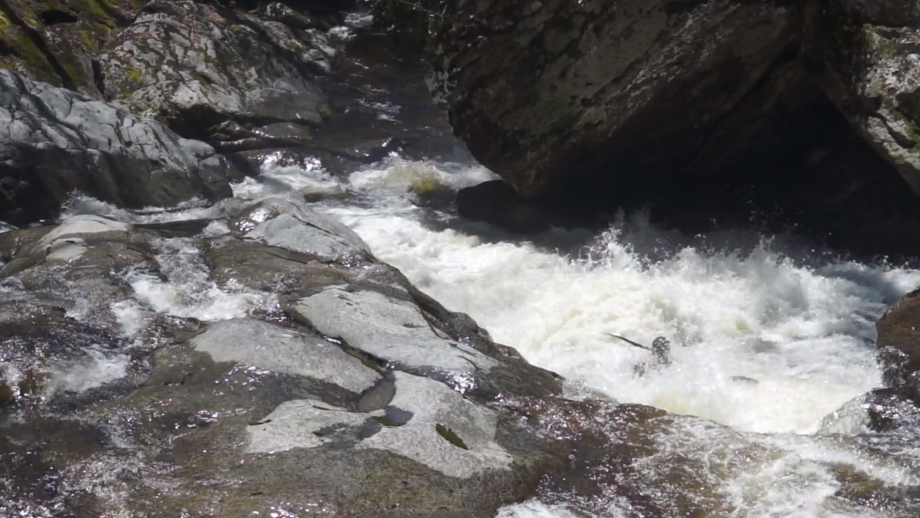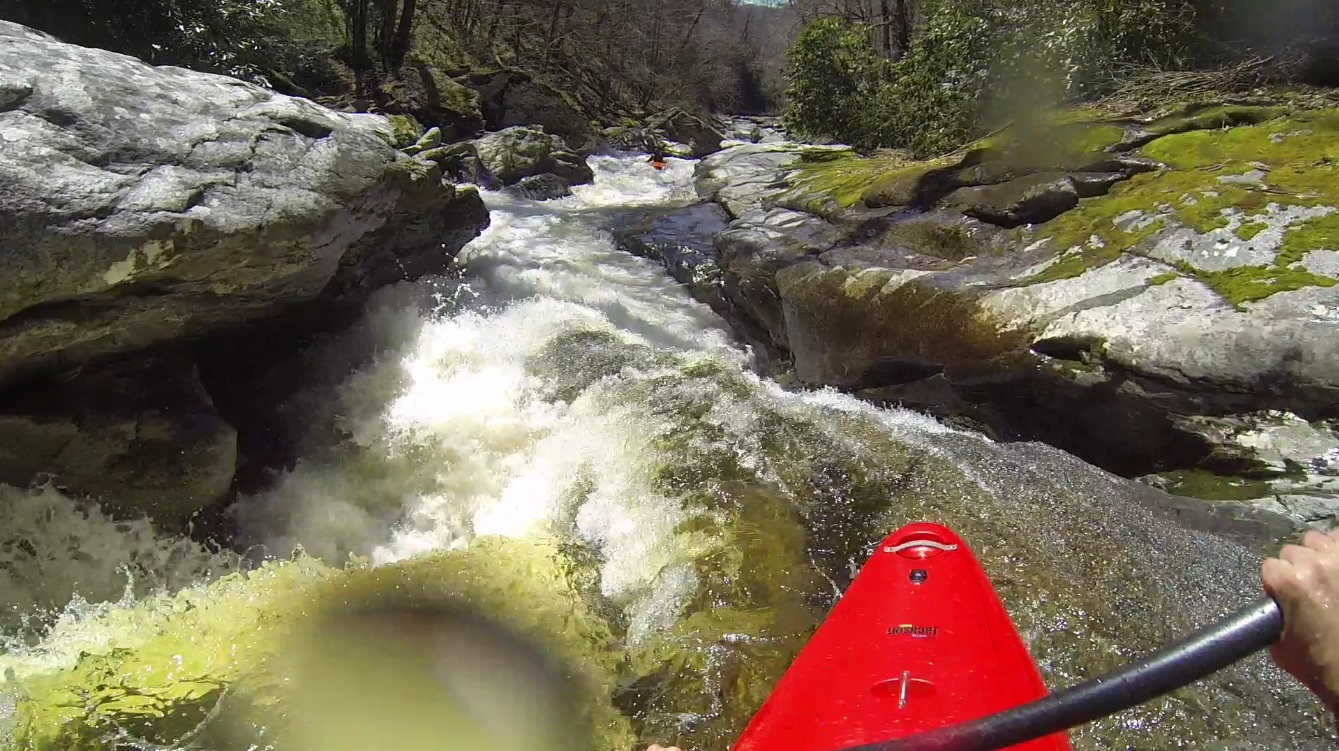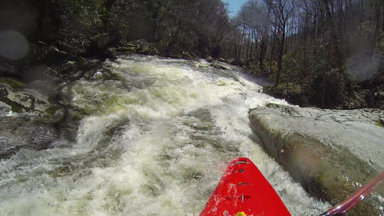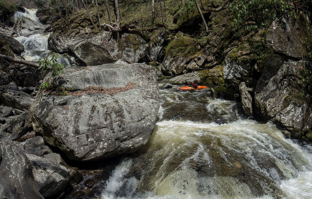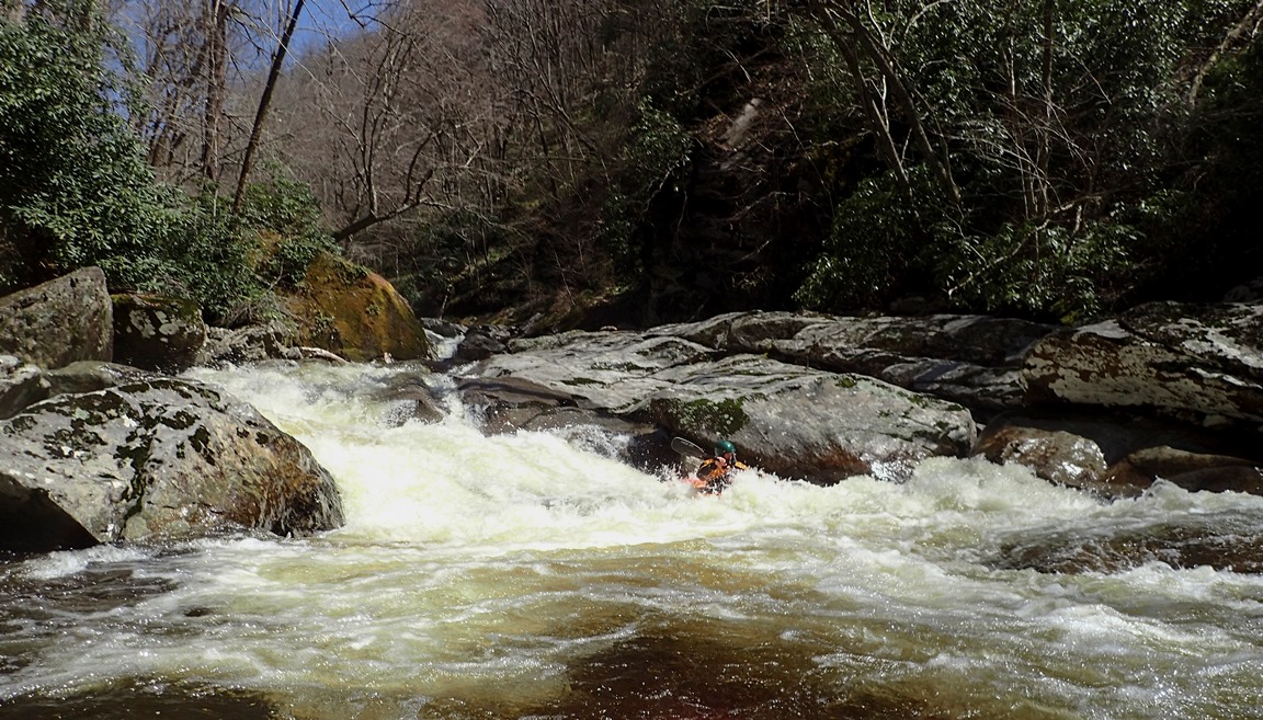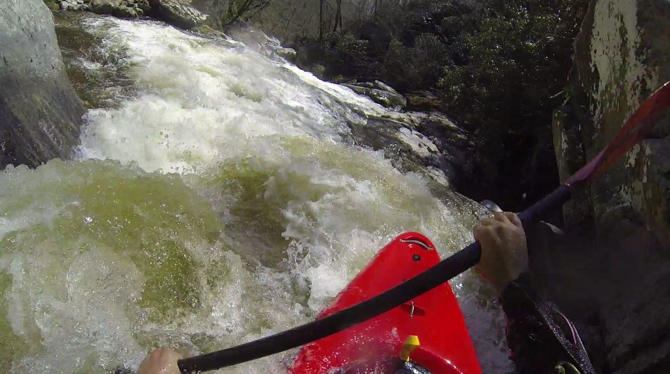 Mortal Combat (V to V+). It is starting to get steep! Eddy out on the right to scout from above and potentially portage the spout. The old entrance on river left is full of wood now and the new entrance requires enough water to soften the landing. If the water is ~10" or higher you can boof the left side of the right channel for a fun 8-10' boof. Others choose to portage on the right and put in at an eddy just below. Below the spout, the river starts sliding, start left of center. This slides into a fold and then up and over a hump... you want to be on top of (erroring left) of the big hump. Below, the river slides and hits a small hole with momentary deep water to grab to pull yourself as far right as you can get. There are two small fans of water, you want to go between the two erroring to going over the top of the right fan. This will set you up for the final slide and lands you clear you of the hole. If for some reason you get pushed far left on the final slide it finishes by landing in crack that then lands you in an undercut and bad backed up hole. Lots of swims happen by that error.