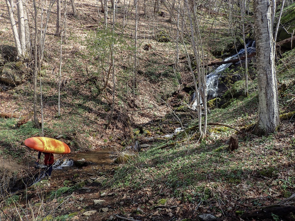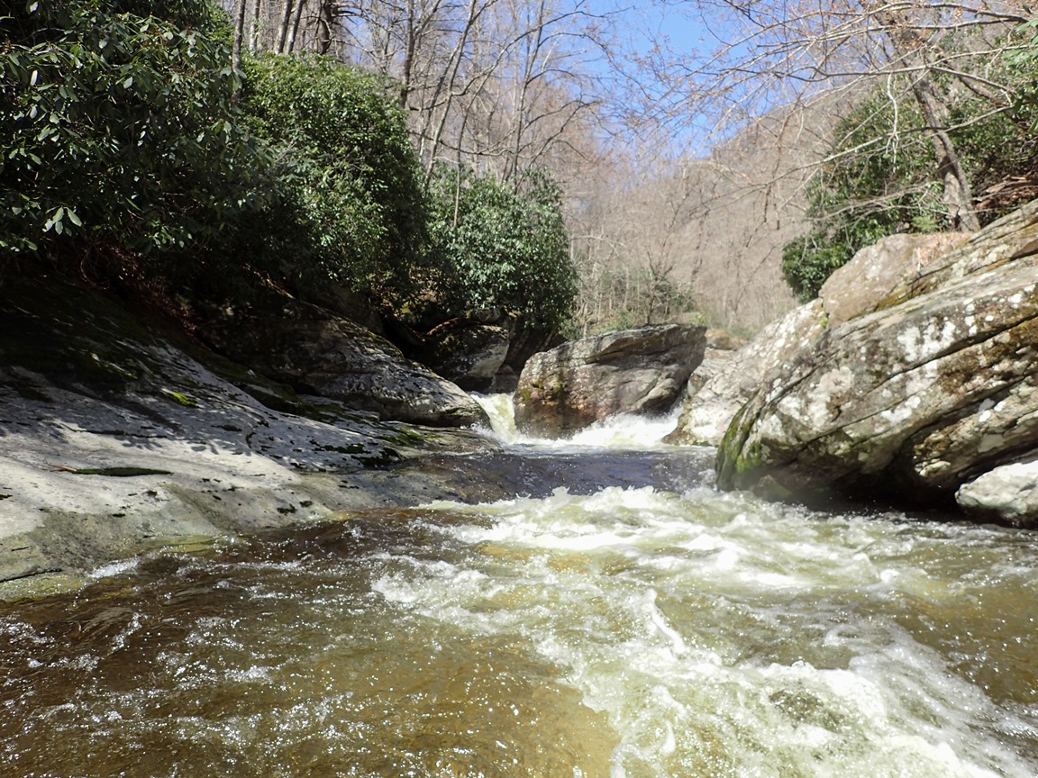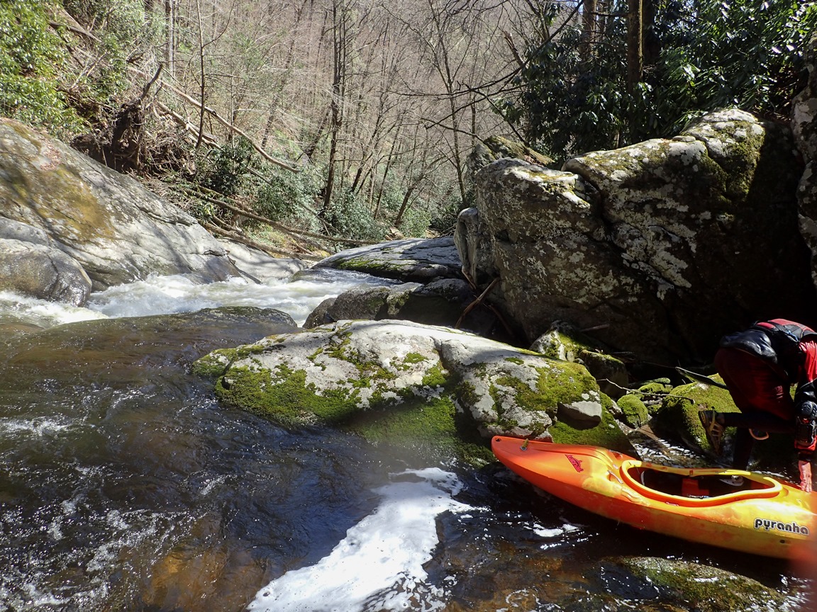 Put-in: Head back downriver for 0.4 miles on Big Cove Rd and look for Calhoun Rd, turn left and climb steeply. Drive slowly as several homes own animals that are often found on the street. After a sharp left bend the road turns one lane, continue straight. A bigger looking rd goes off to the right but this is a driveway, stay straight on the very small one lane rd. Now 100 ft later a small paved road goes off to the right, stay straight on what turns into a dirt road. Climb this steeply up to the first hard right hand bend. There is a turn out here or in 100 feet that you can park at if you did not bring your 4WD High Clearance truck. If you did, look to your left as you make the bend and spot the rough road climbing steeply. This first 100 yards is the worst of it. After that you will be on a railroad grade though it is rutted at times. Continue to the end of the road and park, this is the upper parking area. If you are parking at the lower spot... you walk the same road. From the upper parking area, take the trail upriver... there are a lot of trees down to duck or climb after so the hike goes slowly. From the lower parking expect 40-50 minutes. Hike until you can see the river less than 100 feet below you, you will come to a spot where the trail disappears in a landslide scree field. To put in at Anaconda, descend the scree field to the pool above Anaconda. If you want Lord of the Rings, cross the scree field before descending.
