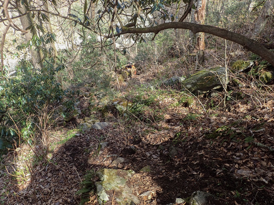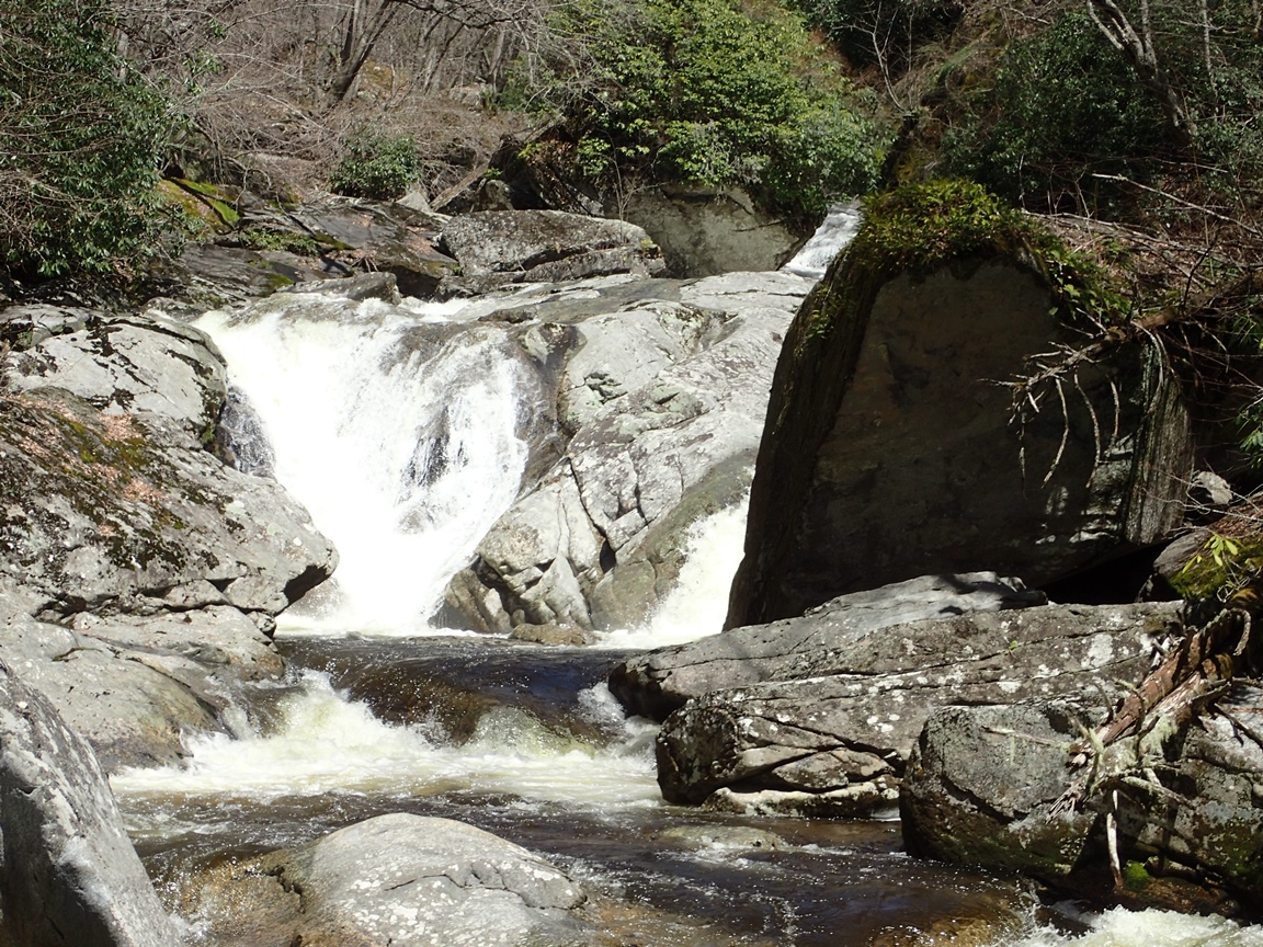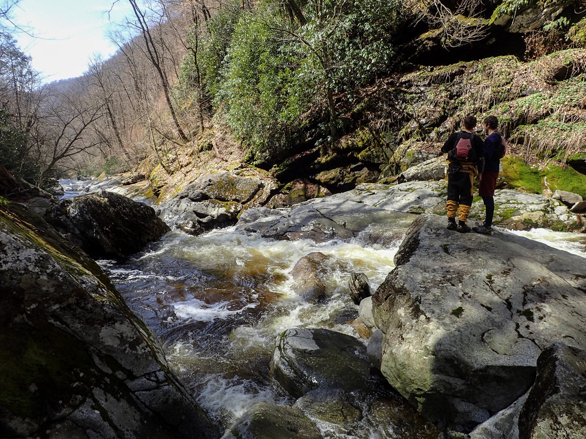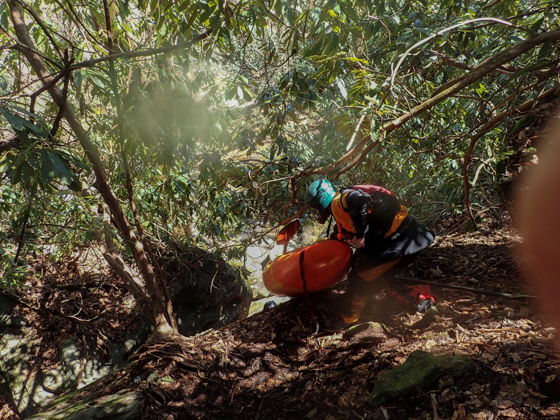 Put-in: Head back downriver for 0.4 miles on Big Cove Rd and look for Calhoun Rd, turn left and climb steeply. Drive slowly as several homes own animals that are often found on the street. After a sharp left bend the road turns one lane, continue straight. A bigger looking rd goes off to the right but this is a driveway, stay straight on the very small one lane rd. Now 100 ft later a small paved road goes off to the right, stay straight on what turns into a dirt road. Climb this steeply up to the first hard right hand bend. There is a turn out here or in 100 feet that you can park at if you did not bring your 4WD High Clearance truck. If you did, look to your left as you make the bend and spot the rough road climbing steeply. This first 100 yards is the worst of it. After that you will be on a railroad grade though it is rutted at times. Continue to the end of the road and park, this is the upper parking area. If you are parking at the lower spot... you walk the same road. From the upper parking area, take the trail upriver... there are a lot of trees down to duck or climb after so the hike goes slowly. From the lower parking expect 40-50 minutes. Hike until you can see the river less than 100 feet below you, you will come to a spot where the trail disappears in a landslide scree field. To put in at Anaconda, descend the scree field to the pool above Anaconda. If you want Lord of the Rings, cross the scree field before descending.