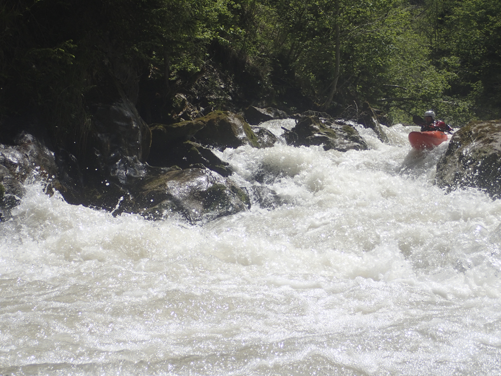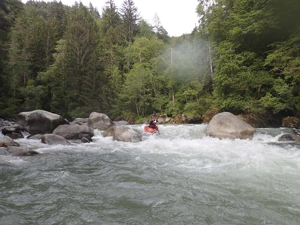 Put-in: From take-out, cross the bridge at the first opportunity, then turn left and go up the inside of the other channel at the confluence onto Via Cesare Battisti. Continue going up to the T, which is about 2 km and then turn left to cross the river and then turn right onto Via Brennero. After 1.1 km take the right onto Via Vecchia della Pusteria. Continue up this road, eventually merging onto SS49 heading towards Pusteria. 6.3 km since you took the turn on Pusteria, there is a restaurant on the left. This is the parking for put-in. To find the trail, cross the road and walk down to the train tracks... there is a trail on the left that crosses under the tracks.