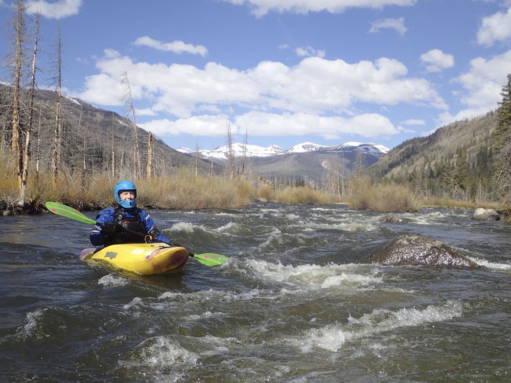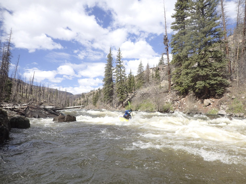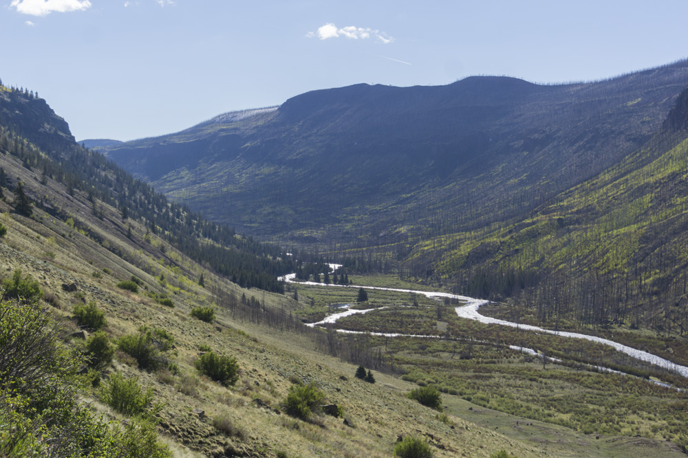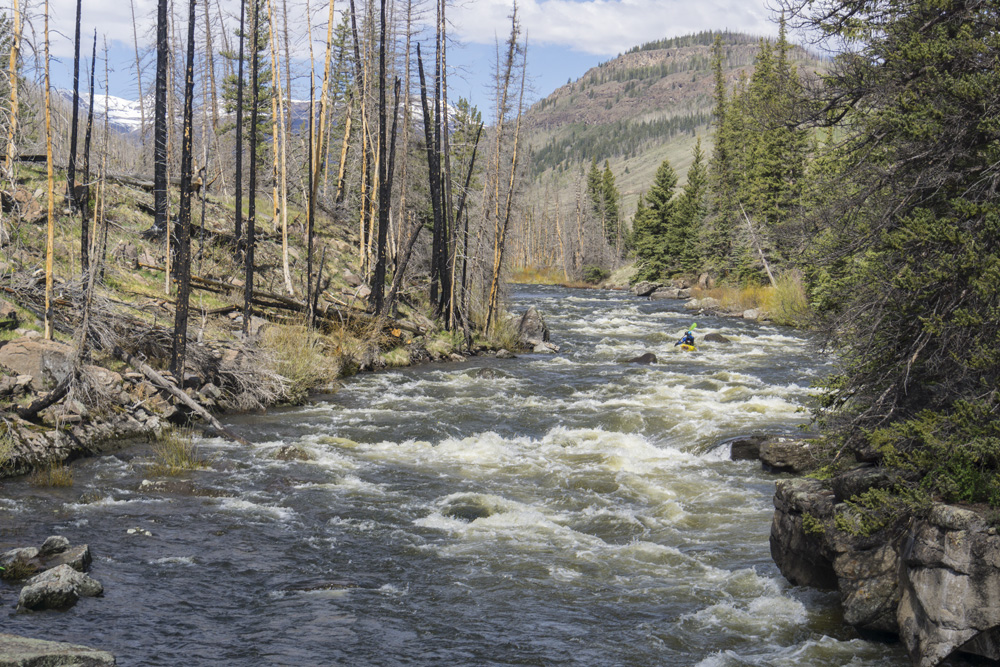 - Put-in (II+). Directly below put-in is the biggest action of the first 2 miles. Its just some big waves and in 2021, a tree duck. But it mellows out not far below and you have the section that you saw on the drive in as it meanders through the valley with nice views if you look back upstream. It is too bad this all burned back in 2013 as the burned trees do take away some of the aesthetic.